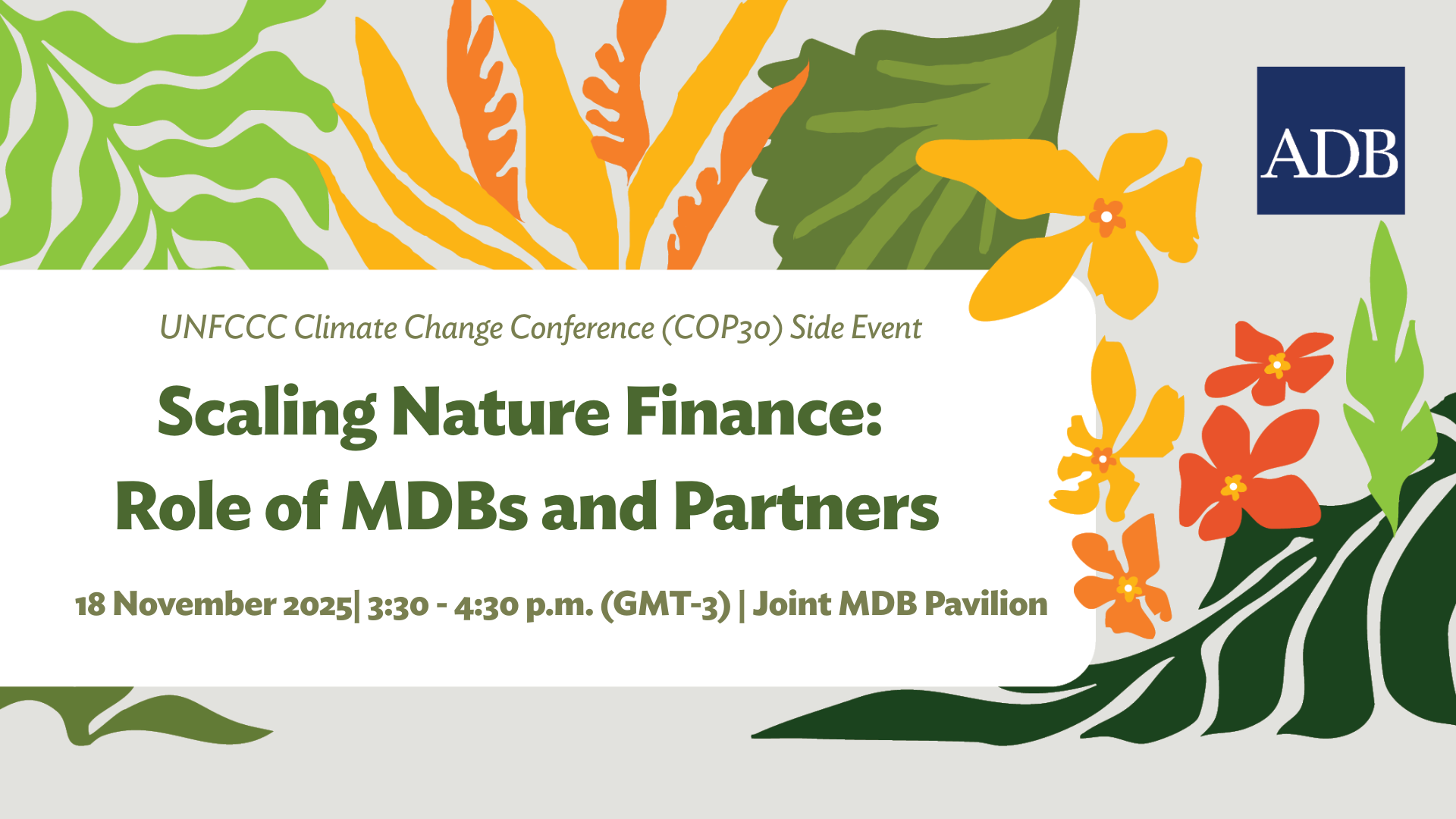 COP 30 Side Event: Scaling Nature Finance: Role of MDBs and Partners 17 November 2025 Brazil 📅 18 November 2025 🕒 3:30–4:30 PM (GMT-3) 📍 Joint MDB Pavilion Scaling nature finance is essential for climate resilience, biodiversity conservation, and sustainable development. Healthy ecosystems—forests, wetlands, grasslands—provide services like flood protection, temperature regulation, and vital inputs for economic sectors. Agriculture, for instance, faces rising climate risks while contributing nearly half of food system emissions. Nature finance offers a pathway to transform agri-food systems through sustainable agriculture, land restoration, and ecosystem-based adaptation—turning them into nature-positive, resilient, and inclusive engines of growth. In this session, International Financial Institutions (IFIs) and partners come together to exchange insights on approaches and tools to expand nature finance. Building on the MDB Joint Statement on Nature, People and Planet (2021), ADB and its fellow Multilateral Development Banks (MDBs) are working collectively to scale investments and enhance impact. Join ADB and our partners as we discuss how IFIs collaborate with governments and technical institutions to turn nature-positive project concepts into investment-ready programs at scale. Learn more: https://www.adb.org/cop/cop30/scaling-nature-finance-role-mdbs-partners…; Program and Learning Materials Disclaimer The views expressed on this website are those of the authors and do not necessarily reflect the views and policies of the Asian Development Bank (ADB) or its Board of Governors or the governments they represent. ADB does not guarantee the accuracy of the data included in this publication and accepts no responsibility for any consequence of their use. By making any designation of or reference to a particular territory or geographic area, or by using the term “country” in this document, ADB does not intend to make any judgments as to the legal or other status of any territory or area. Event Coordinator/s Environment Thematic Group ADB Organizer/s Environment Thematic Group Read Also ADB.org Event Page Topics Agriculture and Natural Resources Climate Change Environment