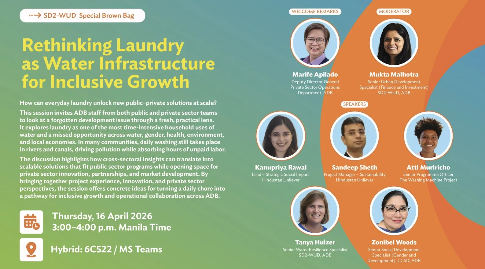 Share the Load: Rethinking Laundry as Water Infrastructure for Inclusive Growth 16 April 2026 On Thursday, April 16, a cross-sector group of practitioners, policymakers, and innovators came together for an internal webinar on an issue that affects everyone but is rarely framed as development work: laundry. Speakers explored how everyday washing practices intersect with water security, gender equality, health, climate, and urban development—and how practical improvements can deliver meaningful development gains. Read the brochure here. Setting the Scene – DDG Marife Apilado (Deputy Director General, PSOD) DDG Marife Apilado opened the session by noting that laundry is an everyday activity that rarely features in policy or infrastructure discussions—even though it has a direct influence on development outcomes. For billions of people, especially in low-income and water-stressed settings, washing clothes remains manual, time-consuming, and physically demanding. She framed the webinar’s central question: what changes when we treat laundry not as a private household matter, but as part of development systems and service delivery? Laundry: A Hidden Development Issue – Zonibel Woods, Senior Social Development Specialist, Gender and Development, ADB Zonibel Woods described laundry as “invisible infrastructure” at the intersection of unpaid care work, water use, energy demand, pollution, and climate risk. In Asia and the Pacific, she noted, laundry is still largely done by hand, and women and girls carry most of the time and physical burden. This contributes to gender time poverty, reducing time available for education, paid work, and rest. She also highlighted environmental impacts, including microplastic fibers shed from synthetic clothing during washing. While machine washing is a major source of these emissions globally, Zonibel emphasized that the answer is not to place responsibility solely on households. Instead, improved product design, standards, and policy choices can reduce pollution at the source. Treating laundry as a design and planning issue—rather than a behavior-change add-on—opens up low-cost, high-impact options across housing, WASH, and urban programs. Scaling Climate Resilient Urban Sanitation – Sandeep Sheth, Kanupriya Rawal, Suvidha Concept, Hindustan Unilever Sandeep Sheth and Kanupriya Rawal focused on the challenges of delivering reliable water and sanitation services in rapidly growing urban informal settlements, where operational failures and gendered burdens often undermine infrastructure investments. Drawing on the Suvidha concept, they highlighted how an integrated model combining sanitation, water, and laundry services can generate measurable health, economic, gender, and climate benefits. Their presentation clearly demonstrated strong evidence of scalability and impact, and stood out for its rigorous connection between social outcomes, operational practicality, and system‑level sustainability. The Washing Machine Project: Technology, Dignity, and Livelihoods – Atti Muriricho, Senior Program Officer, The Washing Machine Project Atti Muririchio focused on low-resource and humanitarian contexts, where laundry often involves heavy physical labor, health risks, and limited access to water. Drawing on field experience, she noted that women may spend up to 20 hours each week washing clothes by hand. She introduced the Divya manual washing machine, a non-electric device that can reduce water use by about 50% and cut washing time by up to 75%. She shared examples from health facilities and displacement settings, where the machines can strengthen hygiene and day-to-day resilience. She also emphasized service and livelihood models—such as women-run laundrettes paired with training—that can turn laundry from a burden into an income-generating opportunity. What is the Laundry Transformation Initiative? – Tanya Huizer, Senior Water Resilience Specialist, Water and Urban Development, ADB Closing the webinar, Tanya Huizer outlined the rationale for the Laundry Transformation Initiative. She noted that laundry is often overlooked, not because solutions are unavailable, but because it cuts across multiple sectors—water, energy, housing, gender, and urban development—without a clear “owner.” Yet it shapes many priority outcomes, from women’s time and dignity to water efficiency, health, and climate resilience. She introduced the “Laundry Ladder,” a framework that maps step-by-step improvements—from unsafe, labor-intensive handwashing to shared services or efficient mechanical systems. She emphasized that even small upgrades can deliver meaningful benefits, and outlined three areas for action: Integrating laundry into sovereign operations and policy dialogue; Supporting private-sector and service-based solutions; and Convening coalitions across governments, multilateral development banks, corporates, and innovators. She closed by inviting colleagues to contribute to ongoing evidence-building, pilots, and operational entry points. She noted that once the laundry burden is made visible, its relevance across development contexts becomes clear—and difficult to ignore. SPEAKERS Zonibel Woods is a gender and development specialist with over 30 years of experience in advancing gender equality through gender mainstreaming, policy development, and capacity building. Atti Muriricho is a Program Officer at The Washing Machine Project, managing global programme delivery and partnerships to support low‑income communities in humanitarian and development contexts. Sandeep Sheth is a Sustainability Project Manager at Hindustan Unilever, leading urban WASH initiatives and advancing the Suvidha community sanitation and hygiene model. Kanupriya Rawal is a social impact strategist at Hindustan Unilever, leading high‑impact sustainability programmes and shaping large‑scale public initiatives in sanitation and social development across India. Tanya Hui