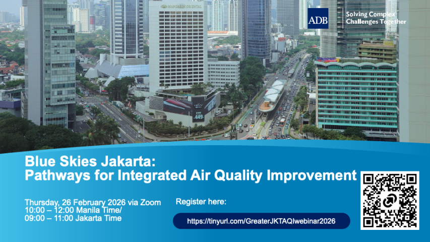 Spotlight Better Air Quality (BAQ) Conference 2026 9 to 13 March 2026 Thailand Clean Air Asia, along with co-organizers, the Asian Development Bank (ADB), the Climate and Clean Air Coalition (CCAC), the Economic and Social Commission for Asia and the Pacific (ESCAP), and the… Blue Skies Jakarta: Dissemination Webinar on Meta Study Insights and Financing Pathways 26 February 2026 Air quality in the Greater Jakarta area remains a significant public health and environmental challenge, with particulate matter (PM) 2.5 levels consistently exceeding national and WHO standards.… Artificial Intelligence (AI) in Health Financing 10 December 2025 As part of the 2025 Universal Health Coverage (UHC) Day campaign, ADB organized the webinar, partnering with Deutsche Gesellschaft für Internationale Zusammenarbeit (GIZ), openIMIS, and Amref… 2025 International Procurement Workshop 26 to 27 November 2025 The International Procurement Workshop, jointly organized by ADB and the Public Procurement Service of Korea (PPS), was held on 26-27 November 2025 in Seoul, Republic of Korea. The workshop… Environment and Nature Learning Week 2025 7 to 8 October 2025 Philippines The Asia and the Pacific is facing the triple planetary crisis of biodiversity loss, pollution, and climate change that require integrated solutions. As a flagship activity under the Environment… Gender-Responsive Climate Action Training 2 October 2025 This training responded to ADB's commitments under the Climate Change Action Plan 2023-2030 and Strategy 2030, which prioritize gender equality and climate action. Recognizing the disproportionate… Community Resilience Partnership Program (CRPP) Partnership Forum 2026 24 to 25 February 2026 Thailand The Community Resilience Partnership Program (CRPP) supports countries and communities in the Asia and Pacific region to scale up investments in climate adaptation that explicitly target the nexus… Building Climate Resilience Through Social Protection 10 to 12 November 2025 Philippines As climate-related risks escalate across Asia and the Pacific, the need to equip vulnerable communities with tools for resilience is more urgent than ever. Social protection (SP) systems -when… Scaling What Works: Private Sector Development as Catalyst for Growth in Southeast Asia 18 November 2025 Mobilizing private sector capital was essential to narrowing the multitrillion-dollar financing gap for sustainable development in Asia and the Pacific—a gap that public funds alone could not fill… PreviousNext Major Events ADB at UNFCCC Climate Change Conference (ADB@COP30)10 to 21 November 2025 The Government of Brazil hosted the 30th UNFCCC Climate Change Conference (COP30) in Belém, Pará, in the heart of the Amazon. The meeting comprised the thirtieth session of the Conference of the… International Anticorruption Day 2025 - Embedding a Culture of Integrity: Lessons from Local Government and Procurement11 December 2025 ADB's International Anticorruption Day (IAD) celebration concluded on 11 December 2025. This year’s commemoration focused on “Embedding a Culture of Integrity: Lessons from Local Governments… Chemicals and Wastes Financing Partnership Facility Roundtable Meeting22 October 2025 The Asian Development Bank (ADB) hosted a consultative meeting on the proposed Chemicals and Wastes Financing Partnership Facility (CWFPF), an operational platform that will support sovereign… Civil Society Partnership Days: Papua New Guinea21 to 22 October 2025 The Papua New Guinea (PNG) Civil Society Partnership Days brought together the Asian Development Bank (ADB), the Government of Papua New Guinea, and civil society organizations… Environmental Safeguard Conference and Environmental and Social Framework Orientation Workshop for Central and West Asia, and East Asia Regions 29 September to 2 October 2025 ADB hosted the Environmental Safeguard Conference and Environmental and Social Framework (ESF) Orientation Workshop for Central and West Asia, and East Asia Regions on 29 September – 2 October 2025… Recent Events Asian Development Bank’s Business Opportunities Seminar in Paris, France (European Roadshow 2026)23 March 2026 A cornerstone of development financing in the Asia-Pacific region, the Asian Development Bank (ADB), based in Manila, Philippines, mobilizes tens of billions of dollars annually to support… ADB Business Opportunities Seminar (BOS) - Water Sector Engagement Conference in Georgia19 to 20 March 2026 The United Water Supply Company of Georgia, under the Ministry of Infrastructure of Georgia, plans to conduct a market outreach event for key stakeholders and industry representatives. The purpose… Sustainable Fisheries and Small-Scale Ports: Supporting Livelihoods and Seafood Markets19 March 2026 Fisheries and small-scale ports are vital to coastal economies across Southeast Asia. They support millions of livelihoods, strengthen food security, and connect fishing communities to domestic and… Asian Development Bank’s Business Opportunities Seminar in Zurich, Switzerland (European Roadshow 2026)19 March 2026 ADB’s business outreach team will travel to Europe, including Zurich, to build the capacity of Swiss consultants, contractors, and suppliers in pursuing ADB’s business opportunities, enhance… Leveraging Regional Cooperation and Integration Amid Global Uncertainties12 March 2026 The Asian Economic Integration Report 2026: Leveraging Regional Cooperation and Integration to Navigate Global Uncertainties examines recent progress in regional cooperation and integration by…
