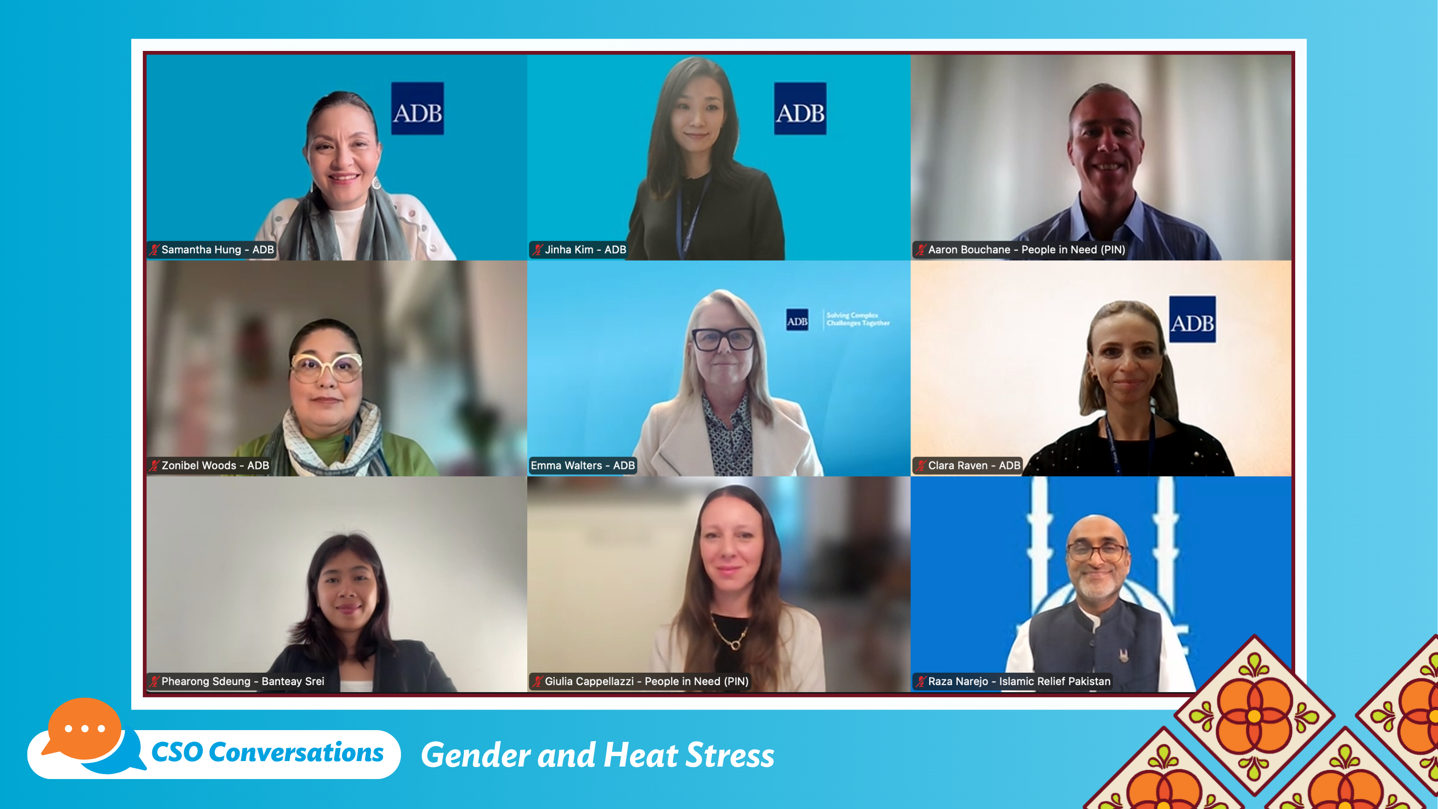 2025 CSO Conversations: Gender and Heat Stress 24 September 2025 Expert panel highlights civil society's role in strengthening women's resilience to heat stress The CSO Conversations webinar on Gender and Heat Stress, held on September 24 via Zoom, brought together civil society organizations (CSO), Asian Development Bank (ADB) staff and development practitioners to address the critical intersection of gender equality and extreme heat resilience across Asia and the Pacific. Jointly presented by ADB’s Climate Change and Sustainable Development Department's Gender Equality Division and the NGO and Civil Society Center, the session highlighted civil society's essential role in strengthening women's resilience to extreme heat. Presentations and Insights ADB's Gender Equality Division discussed a technical assistance Strengthening Women’s Resilience to Heat Stress in Asia and the Pacific, emphasizing that heat stress poses profound threats to humans, ecosystems, economies, and societies. The ADB Technology Innovation Challenge awarded a $500,000 grant for cooling solutions benefiting women farmers in Cambodia, demonstrating that innovations work best when women's lived experiences inform their development. Civil society organizations Banteay Srei, People in Need (PIN) UK, and Islamic Relief Pakistan shared insights from their gender-responsive heat resilience projects. The Kampot Cooling consortium, which included CSOs and the private sector, presented their winning project from the ADB Technology Innovation Challenge, which pilots solar-powered cooling and irrigation systems for Cambodian pepper farms. This innovation addresses agricultural vulnerability where heat and drought have caused up to 80% crop losses, severely impacting women central to the industry. Their gender assessment revealed income losses of 30-40% linked to heat-related productivity drops, with 90% of surveyed women having never heard of "gender." Islamic Relief Pakistan presented findings from their rapid risk assessment across five provinces through 24 focus group discussions and 28 key informant interviews. The assessment revealed that reduced working hours from 6-8 hours to just 3-4 hours severely impact women farmers' incomes, while extreme heat disrupts health and education sectors, particularly affecting female students and teachers in overheated classrooms with inadequate infrastructure. Discussion Discussions highlighted critical gaps in heat stress preparedness and the importance of localized solutions co-developed with women. The session reinforced that lasting change requires direct community engagement, data-driven decision-making, and leveraging civil society's specialized knowledge to ensure the most vulnerable populations are not left behind. Questions arose around scaling solutions, private sector investment, incorporating new technologies in ADB operations, technology affordability, education, and heat-resilient construction generated active engagement throughout the webinar, demonstrating the urgency and importance of addressing gendered climate impacts. About CSO Conversations CSO Conversations is an ADB webinar series showcasing effective and meaningful CSO engagement in development projects. Initiated in 2023, the series is organized by ADB’s NGO and Civil Society Center under the Fragility and Engagement Division of the Climate Change and Sustainable Development Department. Program and Learning Materials 24 September 2025 Session / Activity Title Speaker(s) 2:00–2:03 p.m. Introduction and Welcome Samantha Hung Director, Gender Equality Division, Climate Change and Sustainable Development Department, ADB 2:03–2:20 p.m. Strengthening Women’s Resilience to Heat Stress in Asia and the Pacific Zonibel Woods, Senior Social Development Specialist and Jinha Kim, Gender Specialist (Climate Change), Gender Equality Division, Climate Change and Sustainable Development Department, ADB 2:20–2:45 p.m. Kampot Cooling: Innovative Technology Solution to Save Cambodia’s World-Famous Pepper Aaron Bouchane, Country Director PIN Cambodia, Phearong Sdeung, Executive Director Banteay Srei, and Giulia Cappellazzi, Senior Gender Equality and Social Inclusion Advisor PIN Cambodia 2:45–2:55 p.m. CSO Research on Gender and Heat Stress Raza Narejo, Deputy Country Director, Islamic Relief Pakistan 2:55–3:10 p.m. Q&A Moderator: Emma Walters, Senior Social Development Specialist, NGOC, Climate Change and Sustainable Development Department, ADB 3:10–3:15 p.m. Summary and Close Emma Walters, Senior Social Development Specialist, NGOC, Climate Change and Sustainable Development Department, ADB Disclaimer The views expressed on this website are those of the authors and do not necessarily reflect the views and policies of the Asian Development Bank (ADB) or its Board of Governors or the governments they represent. ADB does not guarantee the accuracy of the data included in this publication and accepts no responsibility for any consequence of their use. By making any designation of or reference to a particular territory or geographic area, or by using the term “country” in this document, ADB does not intend to make any judgments as to the legal or other status of any territory or area. Event Coordinator/s Emma Walters ADB Organizer/s Climate Change and Sustainable Development Gender Equality Division Topics Capacity Development Civil Society Gender Equality
