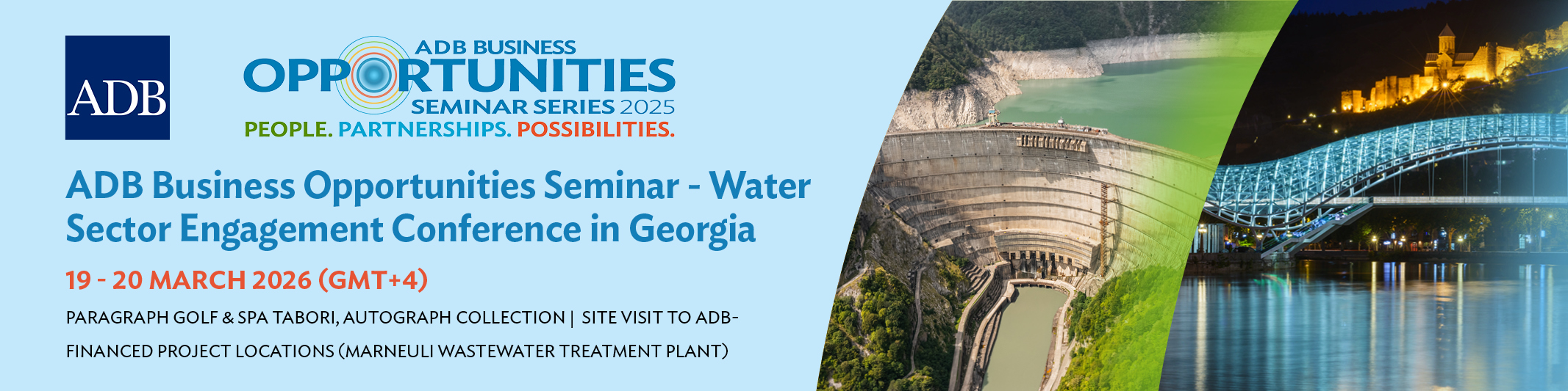 Series: ADB Business Outreach Activities ADB Business Opportunities Seminar (BOS) - Water Sector Engagement Conference in Georgia 19 to 20 March 2026 Paragraph Golf & Spa Tabori, Autograph Collection, Georgia The United Water Supply Company of Georgia, under the Ministry of Infrastructure of Georgia, plans to conduct a market outreach event for key stakeholders and industry representatives. The purpose of this event is to brief participants on investment opportunities within agencies of the Ministry of Infrastructure, facilitate knowledge exchange, provide information on the new ADB Procurement Directive for ADB Borrowers, and respond to clarification requests in order to enhance participation in the upcoming tenders to be advertised by the Ministry. Objectives The objective of the event is to enable early market engagement with potential bidders for upcoming tenders, inform them about forthcoming opportunities, and obtain their feedback to further improve the tendering process and increase participation. The invitation to participate was published on ADB’s website on 23 March 2026. Program and Learning Materials 19 March 2026 Session / Activity Title Speaker(s) Materials will be uploaded once available after the event. Disclaimer The views expressed on this website are those of the authors and do not necessarily reflect the views and policies of the Asian Development Bank (ADB) or its Board of Governors or the governments they represent. ADB does not guarantee the accuracy of the data included in this publication and accepts no responsibility for any consequence of their use. By making any designation of or reference to a particular territory or geographic area, or by using the term “country” in this document, ADB does not intend to make any judgments as to the legal or other status of any territory or area. Event Coordinator/s Marie Charmaine Yuson Clarissa Santos Jhoanna Quimson Related Full Agenda ADB Organizer/s Procurement, Portfolio, and Financial Management Department Read Also Business Opportunities Outreach Website MAIN PAGE: ADB Business Outreach Activities ADB Event Webpage ADB Business Center ADB Business Center LinkedIn Topics ADB Administration and Governance Finance