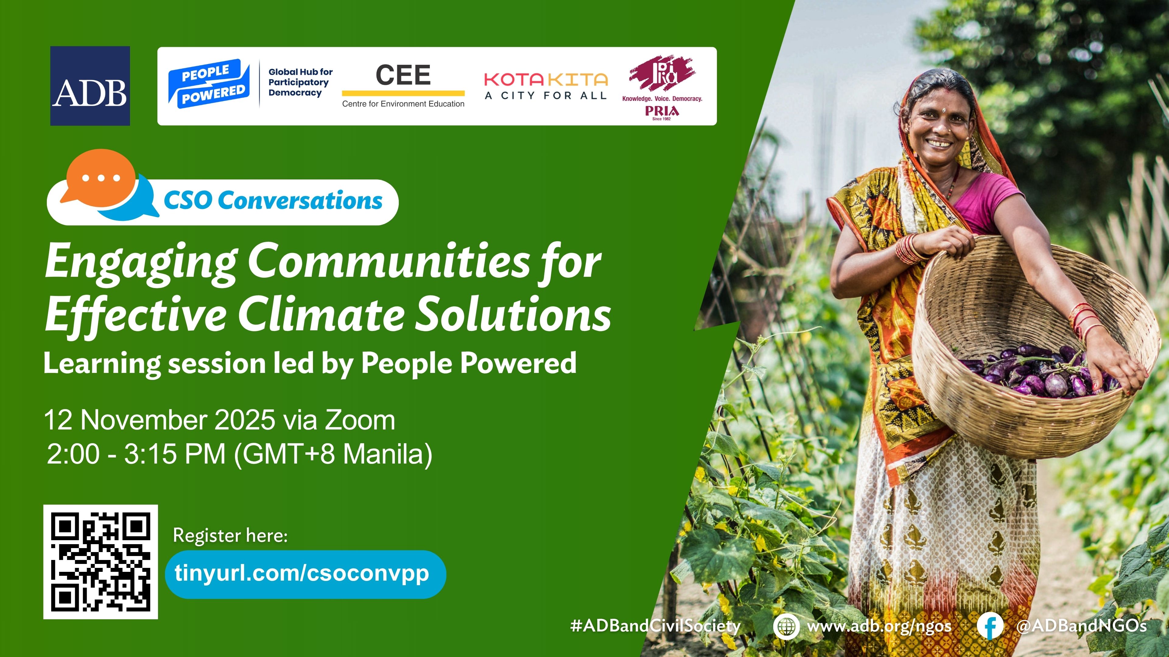 CSO Conversations: Engaging Communities for Effective Climate Solutions 12 November 2025 Philippines On 12 November, the Asian Development Bank's (ADB) NGO and Civil Society Center will host “CSO Conversations: Engaging Communities for Effective Climate Solutions” to discuss how meaningful community engagement can lead to better outcomes in planning and implementing climate and environmental projects. Marking a first in this kind of collaboration for the CSO Conversation knowledge-sharing series, CCFE-NGOC has partnered with People Powered to organize and deliver this session. People Powered is a global union of over 200 local and national organizations, government practitioners, researchers, and advocates that aims to increase and improve citizen participation in government. This session will feature country examples of meaningful stakeholder engagement and will share practical tools to help plan, implement, and improve participatory programs. Citizen engagement experts from Kota Kita (Indonesia), Centre for Environment Education (India), and PRIA (India) will lead discussions on how early engagement, co-implementation, and community empowerment can enhance development effectiveness. Register now! Program and Learning Materials 12 November 2025 Session / Activity Title Speaker(s) Preliminaries Welcome and Introductions Maria Lucien, People Powered (Moderator) Preliminaries Sharing on how CSO engagement fits into ADB's priorities and frameworks ADB NGO and Civil Society Center Lighting talk From information-sharing to co-creation: Why early engagement pays off Silvania Utami, Kota Kita (Indonesia) Q&A Maria Lucien, People Powered Lightning talk Participation as partnership: CSOs as co-implementers and accountability partners Navneet Wadkar, Centre for Environment Education, CEE (India) Lightning talk Closing the loop: Community insights for learning and resilience Dr Anshuman Karol, PRIA Moderation discussion and Q&A, and presentation of climate engagement tools Maria Lucien, People Powered Q&A Maria Lucien, People Powered Closing Maria Lucien, People Powered Disclaimer The views expressed on this website are those of the authors and do not necessarily reflect the views and policies of the Asian Development Bank (ADB) or its Board of Governors or the governments they represent. ADB does not guarantee the accuracy of the data included in this publication and accepts no responsibility for any consequence of their use. By making any designation of or reference to a particular territory or geographic area, or by using the term “country” in this document, ADB does not intend to make any judgments as to the legal or other status of any territory or area. Event Coordinator/s Michelle Ann Ramirez ADB Organizer/s Climate Change and Sustainable Development Partner Organization/s People Powered Topics Civil Society Climate Change Social Development and Protection