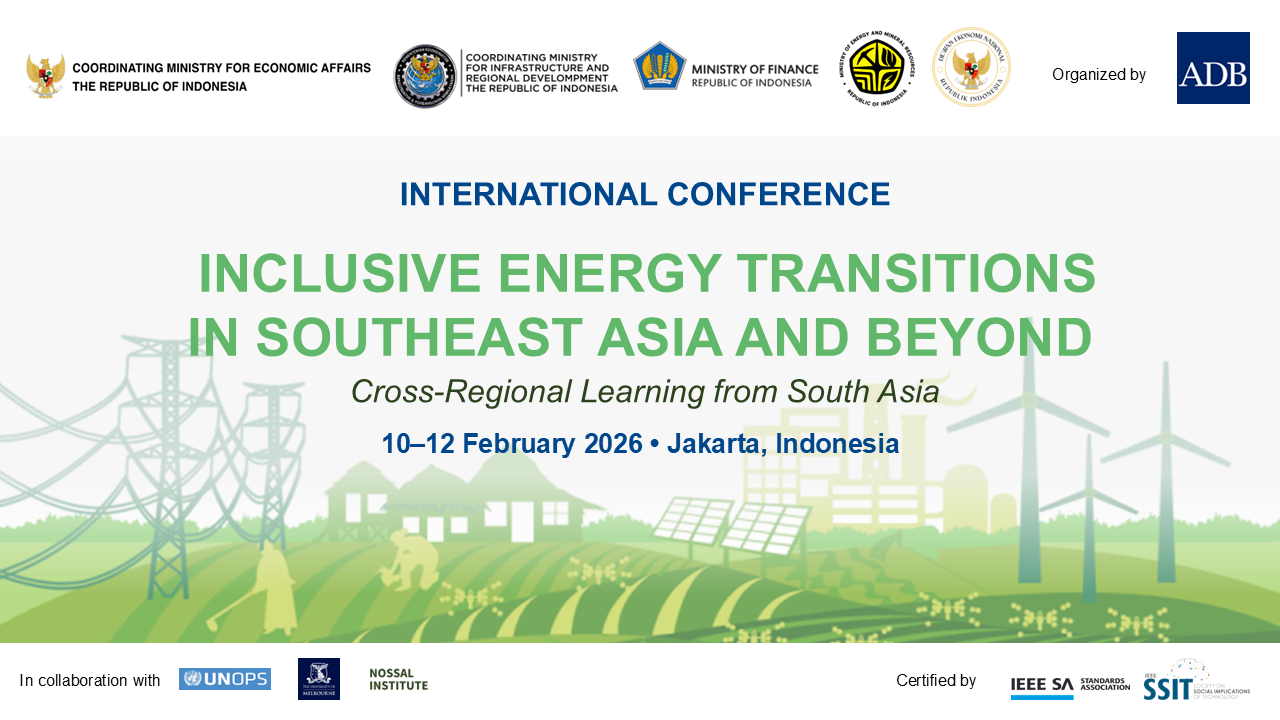 Series: ADB Data Room: Inclusive Energy Solutions Initiative International Conference on Inclusive Energy Transition in Southeast Asia and Beyond 10 to 12 February 2026 Indonesia The global energy transition presents both opportunities and challenges, requiring approaches that prioritize equity, climate justice, and social inclusion. Just energy transitions—from fossil fuel-based systems to renewable energy—must ensure the active participation of vulnerable and marginalized populations, emphasizing their ownership of and benefits from the transition. This conference—jointly organized by ADB's Energy and Human and Social Development Sector Offices with the Indonesia Resident Mission, Indonesia’s Coordinating Ministry of Economic Affairs, Coordinating Ministry for Infrastructure and Regional Development, Ministry of Energy and Mineral Resources, and National Economic Council—builds on a series of national and subregional workshops in South Asia in 2024-2025. See details of previous events. It provides a timely opportunity to extend knowledge exchange to Southeast Asia, fostering cross-regional learning and South–South cooperation by drawing on operational models, community-led innovations, and multidisciplinary approaches validated in South Asia and ASEAN. The conference will serve as a capstone event to consolidate lessons learned and identify scalable pathways for inclusive energy transitions across diverse country contexts. The event is organized in collaboration with the United Nations Office for Project Services (UNOPS) and the Nossal Institute for Global Health, and it is certified by the IEEE Standards Association and the IEEE Society on Social Implications of Technology (SSIT). Objectives The conference seeks to: Examine energy transitions in the context of broader just transition efforts, including alignment of agendas and consensus around core concepts and terminology. Build on the experience of integrating gender equality and social inclusion in the ADB energy portfolio in Southeast and South Asia, highlighting lessons and potential pathways for replication and scale-up. Facilitate knowledge sharing and collaboration among government agencies, ADB project implementers, academia, civil society organizations, and other key energy stakeholders. Explore the risks and opportunities of transitioning to green sectors and renewable energy, including impacts on labor markets, economic diversification, fiscal planning, and social protection schemes. Program and Learning Materials 10 February 2026 Session / Activity Title Speaker(s) Materials will be uploaded once available after the event. Disclaimer The views expressed on this website are those of the authors and do not necessarily reflect the views and policies of the Asian Development Bank (ADB) or its Board of Governors or the governments they represent. ADB does not guarantee the accuracy of the data included in this publication and accepts no responsibility for any consequence of their use. By making any designation of or reference to a particular territory or geographic area, or by using the term “country” in this document, ADB does not intend to make any judgments as to the legal or other status of any territory or area. Event Coordinator/s Francesco Tornieri ADB Organizer/s Energy Sector Office Human and Social Development Sector Office Read Also ADB Data Room: Inclusive Energy Solutions Initiative Partner Organization/s Indonesia’s Coordinating Ministry of Economic Affairs Indonesia’s National Economic Council United Nations Office for Project Services Nossal Institute, University of Melbourne IEEE Standards Association IEEE Society on Social Implications of Technology ndonesia’s Coordinating Ministry for Infrastructure and Regional Development Indonesia’s Ministry of Energy and Mineral Resources Topics Energy Environment Social Development and Protection Urban Development