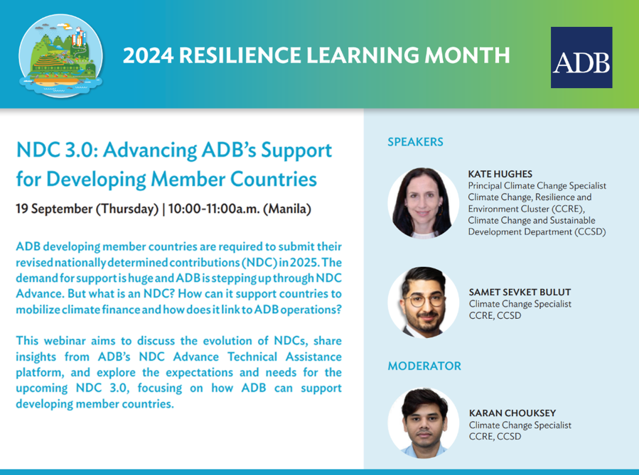 NDC 3.0: Advancing ADB’s Support for Developing Member Countries 19 September 2024 The webinar focused on the critical role of NDC 3.0 in raising climate ambitions across the Asia-Pacific region and how ADB supports developing member countries (DMCs) in achieving these climate actions. NDC 3.0 represents the next iteration of nationally determined contributions, emphasizing enhanced ambition and implementability, as countries prepare their updates for 2025 in alignment with the Paris Agreement goals. Key topics included lessons from NDC 2.0 implementation through ADB’s NDC Advance technical assistance platform, which has supported over 23 DMCs. Panelists shared insights on overcoming systemic barriers, enhancing project pipelines, and mobilizing finance. The event also introduced forward-looking tools such as the NDC 3.0 Navigator to guide countries in aligning their NDCs with climate and development priorities. The NDC 3.0 Navigator is an interactive tool that supports the development of NDCs to be submitted in 2025. It helps countries raise ambition and accelerate implementation of the next round of NDCs (NDCs 3.0). Read: Event Summary Program and Learning Materials 19 September 2024 Session / Activity Title Speaker(s) Session 1 Understanding NDCs – Importance and the Role of MDBs This presentation gives an overview of the role of Nationally Determined Contributions (NDCs) in climate action and the support provided by… Karan Chouksey Session 2 Learnings from NDC 2.0 Implementation and ADB’s NDC Advance TA Platform This presentation gives an overview of the findings and recommendations from the NDC Advance Technical Assistance Platform regarding the… Samet Sevket Bulut Session 3 Looking Ahead to NDC 3.0 –Expectations from DMCs and ADB's Role This presentation provides an overview of the expectations, challenges, and support mechanisms for the third iteration of Nationally Determined… Karan Chouksey Disclaimer The views expressed on this website are those of the authors and do not necessarily reflect the views and policies of the Asian Development Bank (ADB) or its Board of Governors or the governments they represent. ADB does not guarantee the accuracy of the data included in this publication and accepts no responsibility for any consequence of their use. By making any designation of or reference to a particular territory or geographic area, or by using the term “country” in this document, ADB does not intend to make any judgments as to the legal or other status of any territory or area. Event Coordinator/s Sugar Gonzales Karan Chouksey ADB Organizer/s Climate Change, Resilience, and Environment Cluster Read Also 2024 Resilience Learning Month Topics Climate Change Disaster Risk Management