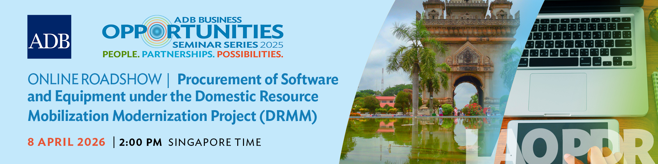 Series: ADB Business Outreach Activities Online Roadshow - Procurement of Software and Equipment under the Domestic Resource Mobilization Modernization Project (DRMM) 8 April 2026 2:00 - 3:00 PM (GMT+8), Online via Zoom The Tax Department of the Ministry of Finance of the Lao People's Democratic Republic, invites you to attend an online roadshow on the upcoming procurement of software and equipment under the Domestic Resource Mobilization Modernization Project (DRMM). Learn more about the project. Objectives The project aims to enhance the TAXRIS information system, develop and introduce an electronic invoicing and data analytical module, and build the Tax Department’s capacity on the use and management of the system. The purpose of the roadshow is to provide an overview of the planned procurement packages, technical requirements, and the procurement process, as well as to offer an opportunity for interested firms to seek clarifications and better understand the project needs. Kindly confirm your attendance by 6 April 2026 by registering for the session at the button accessible on this page. After completing the registration, the Project Implementation Unit (PIU) will send the online meeting link to your registered email address before the event. Program and Learning Materials 08 April 2026 Session / Activity Title Speaker(s) Materials will be uploaded once available after the event. Disclaimer The views expressed on this website are those of the authors and do not necessarily reflect the views and policies of the Asian Development Bank (ADB) or its Board of Governors or the governments they represent. ADB does not guarantee the accuracy of the data included in this publication and accepts no responsibility for any consequence of their use. By making any designation of or reference to a particular territory or geographic area, or by using the term “country” in this document, ADB does not intend to make any judgments as to the legal or other status of any territory or area. Event Coordinator/s Marie Charmaine Yuson Clarissa Santos Jhoanna Quimson ADB Organizer/s Procurement, Portfolio, and Financial Management Department Read Also Business Opportunities Outreach Website MAIN PAGE: ADB Business Outreach Activities ADB Event Webpage ADB Business Center ADB Business Center LinkedIn Topics ADB Administration and Governance Finance