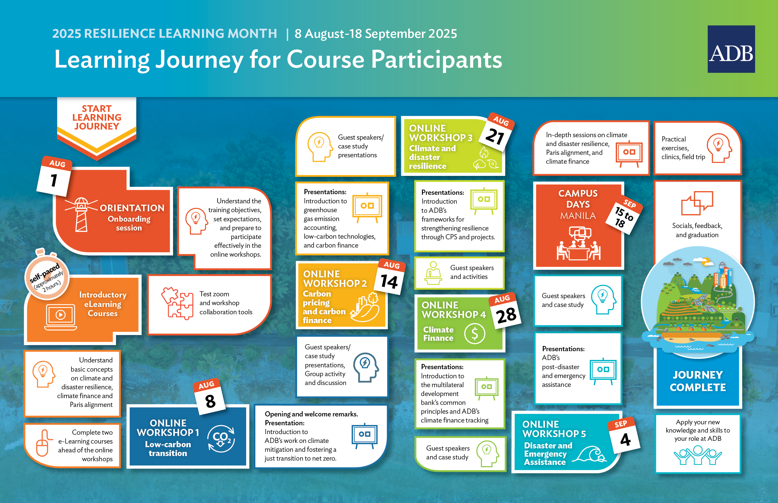 Resilience Learning Month 2025 Capacity Development Course 8 August to 18 September 2025 This year’s program covered six major topics: low-carbon transition, carbon pricing and carbon finance, climate and disaster resilience, climate finance, disaster and emergency assistance, and Paris Agreement alignment. Low-carbon transition: The module explained the opportunities and challenges presented by a low-carbon transition in Asia and the Pacific and outlined how ADB could support countries in achieving their climate goals in a just and inclusive manner while supporting economic growth and development. Carbon markets and carbon pricing: The module introduced carbon pricing as part of the national climate policy architecture and presented an overview of international and domestic carbon markets. It also featured relevant case studies on carbon finance from ADB. Climate and disaster resilience: The module explained how ADB was strengthening the resilience of its developing member countries (DMCs) through upstream, midstream, and downstream support. Climate finance: The module introduced key climate finance concepts and provided insights into global and regional climate finance landscapes. It included discussions on approaches, methodologies, and common principles for tracking climate mitigation and adaptation finance, as well as internal guidance on enhancing climate action in ADB operations. Disaster and emergency assistance: The module introduced ADB’s approach to disaster and emergency assistance, including the financial management of disaster risk, post-disaster needs assessments, and build back better principles. Paris Agreement alignment: The course was designed to deepen participants’ understanding of the process and methodology for aligning ADB operations with the mitigation, adaptation, and climate resilience goals of the Paris Agreement. The hybrid program comprised e-learning courses, interactive online workshops, and in-person activities held at ADB headquarters, including a field day at nearby ADB project sites—the Malolos–Clark Railway Project and the Ayala Electric Mobility Ecosystem Project. A total of 38 ADB staff (23 from headquarters and 15 from resident missions) were selected to participate in the 2025 Resilience Learning Month. The participants included Technical International Staff (Levels 1–4) and Technical Local Staff (Levels 1–8) who played an active role in country programming, project preparation, and implementation, and who were not climate change or disaster risk management specialists but expressed interest in building skills and knowledge in these areas. Program and Learning Materials Online Workshops Session / Activity Title Speaker(s) 8 August 2025 Video: Low-carbon Transition: Introduction This session introduces ADB's work on climate mitigation and fostering a just transition to net zero. 14 August 2025 Video: Carbon Pricing and Carbon Finance This session introduces greenhouse gas emission accounting, low-carbon technologies, and carbon finance. 21 August 2025 Video: Climate and Disaster Resilience This session discusses ADB's frameworks for strengthening resilience through CPS and projects. 28 August 2025 Video: Climate Finance This session highlights the multilateral development bank's common principles and ADB's climate finance tracking. 4 September 2025 Video: Disaster and Emergency Assistance This session presents ADB's post-disaster and emergency assistance. Disclaimer The views expressed on this website are those of the authors and do not necessarily reflect the views and policies of the Asian Development Bank (ADB) or its Board of Governors or the governments they represent. ADB does not guarantee the accuracy of the data included in this publication and accepts no responsibility for any consequence of their use. By making any designation of or reference to a particular territory or geographic area, or by using the term “country” in this document, ADB does not intend to make any judgments as to the legal or other status of any territory or area. Event Coordinator/s Jonathan Austria ADB Organizer/s Climate Change, Resilience, and Environment Cluster Climate Change and Sustainable Development Topics Climate Change Disaster Risk Management Environment