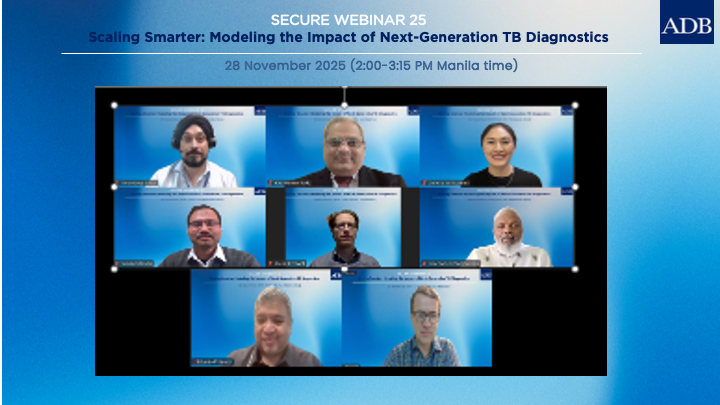 Series: ADB's SECURE Webinar Series SECURE Webinar 25: Scaling Smarter: Modeling the Impact of Next-Generation TB Diagnostics 28 November 2025 Tuberculosis (TB) remained a major public health challenge and a barrier to achieving universal health coverage and the Sustainable Development Goals, particularly in Asia, which accounted for 65% of the global TB burden. Nine ADB developing member countries—Bangladesh, Cambodia, India, Indonesia, Mongolia, Pakistan, the Philippines, Tajikistan, and Viet Nam—collectively contributed nearly half of global TB incidence. Millions of undiagnosed or late-diagnosed cases continued to fuel transmission despite longstanding national TB programs, with high incidence, diagnostic delays, and socio-economic disparities slowing progress. The burden remained concentrated in vulnerable and hard-to-reach populations, including dense urban settlements, rural and remote communities, displaced populations, correctional facilities, and individuals with comorbidities such as HIV or diabetes. Reliance on symptom-based screening missed many asymptomatic or subclinical cases, while dependence on passive case detection and sputum microscopy prolonged diagnostic delays and enabled ongoing transmission. A shift toward proactive, population-level screening of high-risk groups has become essential, particularly with the emergence of AI-assisted digital chest X-rays, molecular diagnostics, smartphone-based cough analysis, and biomarker-based tests that enable earlier and more accurate detection. To support this shift, ADB—through the ExCITD regional technical assistance and in close collaboration with the Stop TB Partnership—completed a jointly commissioned impact modelling and economic assessment of next-generation TB diagnostics and screening approaches. The study evaluated the potential effects of scaling up innovative tools on TB incidence, mortality, and cost implications across nine high-burden countries in Asia and the Pacific. The resulting webinar presented these findings and created a platform, supported by ADB’s SECURE and ExCITD technical assistance programs, for governments and partners to exchange knowledge, review investment priorities, and discuss strategies for accelerating the adoption of advanced TB diagnostics to strengthen health security and advance progress toward TB elimination. Program and Learning Materials 28 November 2025 Session / Activity Title Speaker(s) Opening and Welcome Remarks Eduardo Banzon Presentation ExCITD Overview, Context Setting, and Objectives of Modeling Exercise This presentation gives an overview of key findings on TB and the funding gaps for TB response, and the strategies for TB elimination. Amandeep Singh, Sreenivas Nair Presentation Overview of the New and innovative TB Screening and Diagnostic Technologies This presentation gives an overview of the key innovations in TB diagnostics and analyze the effectiveness of new TB screening strategies. Jacob Creswell Modeling Evidence for Scaling-up TB Diagnostics in Nine High-Burden Countries of Asia and Pacific Kirankumar Rade Sandip Mandal Open Forum and Discussion Denese de Guzman, Moderator Closing Remarks Alexo Esperato Disclaimer The views expressed on this website are those of the authors and do not necessarily reflect the views and policies of the Asian Development Bank (ADB) or its Board of Governors or the governments they represent. ADB does not guarantee the accuracy of the data included in this publication and accepts no responsibility for any consequence of their use. By making any designation of or reference to a particular territory or geographic area, or by using the term “country” in this document, ADB does not intend to make any judgments as to the legal or other status of any territory or area. Event Coordinator/s Eduardo Banzon Alexo Esperato ADB Organizer/s Health Sector Group Human and Social Development Sector Office Read Also ADB's SECURE Webinar Series Topics Health