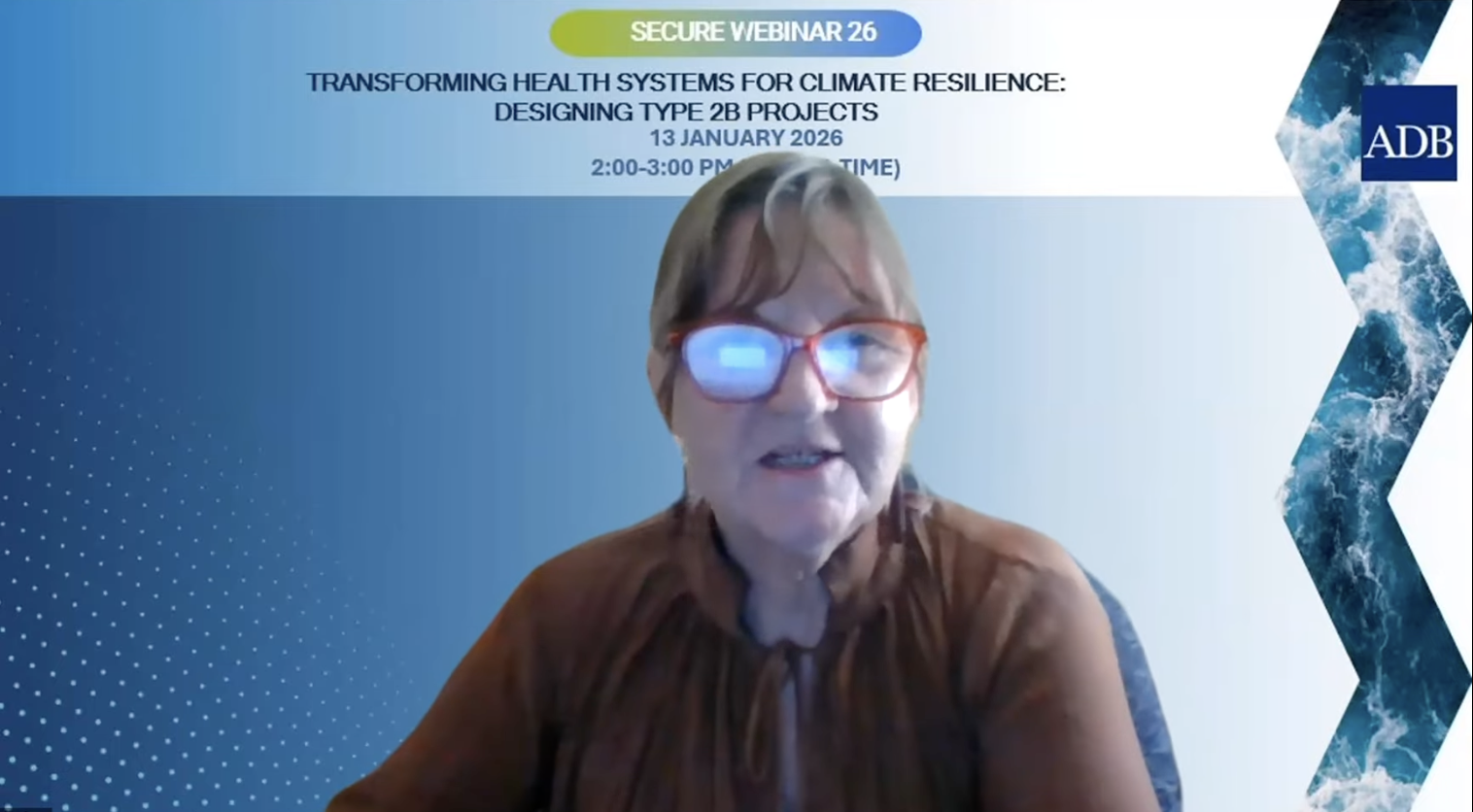 Series: ADB's SECURE Webinar Series SECURE Webinar 26: Transforming Health Systems for Climate Resilience: Designing Type 2B Projects 13 January 2026 Climate change poses escalating risks to health systems across Asia and the Pacific, disrupting service delivery, damaging infrastructure, and increasing the burden of climate-sensitive diseases. The Intergovernmental Panel on Climate Change (IPCC) confirms that climate change is already affecting health outcomes and system performance, with projections indicating up to 14.5 million climate-related deaths and $12.5 trillion in global economic losses by 2050, disproportionately affecting vulnerable regions. At the same time, the health sector contributes more than 5% of global greenhouse gas emissions, highlighting the dual challenge of adaptation and mitigation. Health systems in the region remain inadequately prepared for climate shocks, facing persistent resilience gaps including limited surveillance data, workforce shortages, facility damage, power and communication disruptions, and insufficient surge capacity. Type 2B health projects address these challenges by placing climate adaptation at the core of health system strengthening. These projects adopt a system-level approach, explicitly target climate risks, and apply design principles that meet climate adaptation finance eligibility, allowing the full project financing to be counted as adaptation finance. ADB has committed $34 billion for adaptation and resilience under its $100 billion climate finance target for 2019–2030, with health identified as a priority sector in national climate policies across Asia and the Pacific. To support implementation, the SECURE webinar, in collaboration with Technical Assistance (TA 58085-003) on Building Health System Resilience, facilitated knowledge exchange on Type 2B project design, Climate Vulnerability and Risk Assessments, and practical lessons from climate-resilient health investments, supporting the development of finance-ready, transformational adaptation projects. Session Objectives This session aimed to: Provide a clear understanding of Type 2B project design principles and their specific application in health sector climate adaptation investments. Share methodologies for conducting Climate Vulnerability and Risk Assessments (CVRA) as the foundation for evidence-based Type 2B health project design. Showcase real-world examples of transformational health system adaptation and lessons learned from the Type 2B project implementation. Program and Learning Materials 13 January 2026 Session / Activity Title Speaker(s) Opening Remarks Eduardo Banzon Presentations Defining Transformational Climate Change Adaptation Projects in Health: Classification, Characteristics, and Climate Finance Alignment This presentation gives an overview of the principles and strategies for designing transformational climate adaptation projects in the health sector… Martin Okata Presentations Climate Risk and Vulnerability Assessment: Methodologies for Evidence-Based Health System Adaptation This presentation gives an overview of the methodologies for conducting Climate Risk Vulnerability Assessments (CRVAs) to inform evidence-based… Jasper Tromp Case Study: The Green Primary Care Project in the Lao PDR This presentation gives an overview of the Green Primary Care Project in the Lao PDR, which aims to enhance climate resilience in primary healthcare… Pasoumphon Thammarongsad Reflections and Way Forwards Alexo Esperato Q&A, Synthesis, and Closing Remarks Moderator: Helen Brown Disclaimer The views expressed on this website are those of the authors and do not necessarily reflect the views and policies of the Asian Development Bank (ADB) or its Board of Governors or the governments they represent. ADB does not guarantee the accuracy of the data included in this publication and accepts no responsibility for any consequence of their use. By making any designation of or reference to a particular territory or geographic area, or by using the term “country” in this document, ADB does not intend to make any judgments as to the legal or other status of any territory or area. Event Coordinator/s Eduardo Banzon Alexo Esperato Related Full Agenda ADB Organizer/s Health Sector Group Human and Social Development Sector Office Read Also ADB's SECURE Webinar Series Topics Climate Change Health