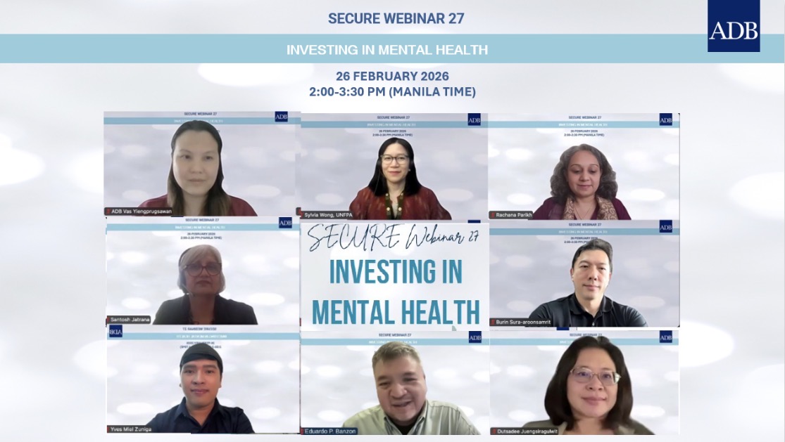Series: ADB's SECURE Webinar Series SECURE Webinar 27: Investing in Mental Health 26 February 2026 Health security and mental health are deeply interconnected, as public health emergencies and large-scale threats often trigger widespread psychological distress and strain health systems. Global health threats, such as pandemics or outbreaks, act as significant stressors that increase the prevalence of anxiety, depression, and post-traumatic stress. Modern health security is increasingly viewing mental health not just as a medical issue, but as a critical component of national and global stability, essential for economic productivity and social order. Mental health remains a global health challenge. It has caused a global economic loss of $2.5 trillion in 2010, expected to increase to $6 trillion by 2030. The burden of mental conditions is more pronounced in low-income countries, particularly in Asia and the Pacific. This webinar discussed the mental health context in Asia and the Pacific and the global experience to inform priorities for investing in mental health in the region. Program and Learning Materials 26 February 2026 Session / Activity Title Speaker(s) Opening Remarks and Introduction Opening Remarks and Introduction This document outlines a regional initiative by ADB to strengthen integrated primary care for noncommunicable diseases and mental health in Asia and… Vasoontara Sbirakos Yiengprugsawan Presentations Economic And Investment Case of Mental Health in Asia and The Pacific This presentation gives an overview of the economic case for mental health investment in Asia and the Pacific, emphasizing costs, service gaps, and… Rachana Parikh Presentations Healthy Bodies, Healthy Minds: Youth Sexual Reproductive Health and Mental Health This presentation gives an overview of how youth sexual and reproductive health and mental health are connected and why they matter for overall well… Sylvia Wong Presentations Experiences from Thai Mental Health Program This presentation gives an overview of Thailand’s mental health programs, focusing on community services and digital approaches to improve care. Dutsadee Juengsiragulwit Panel Discussion Thailand’s Journey: Investing in Mental Health for Sustainable Development This presentation gives an overview of Thailand’s journey in investing in mental health, focusing on policies, services, and improved access to care. Burin Suraaroonsamrit Panel Discussion Reflections from Academia Santosh Jatrana Panel Discussion Insights from Advocate and Civil Society Yves Miel Hugo Zuñiga Closing Closing Remarks Eduardo Banzon Disclaimer The views expressed on this website are those of the authors and do not necessarily reflect the views and policies of the Asian Development Bank (ADB) or its Board of Governors or the governments they represent. ADB does not guarantee the accuracy of the data included in this publication and accepts no responsibility for any consequence of their use. By making any designation of or reference to a particular territory or geographic area, or by using the term “country” in this document, ADB does not intend to make any judgments as to the legal or other status of any territory or area. Event Coordinator/s Eduardo Banzon Alexo Esperato Related Full Agenda ADB Organizer/s Health Sector Group Human and Social Development Sector Office Read Also ADB's SECURE Webinar Series Topics Health
