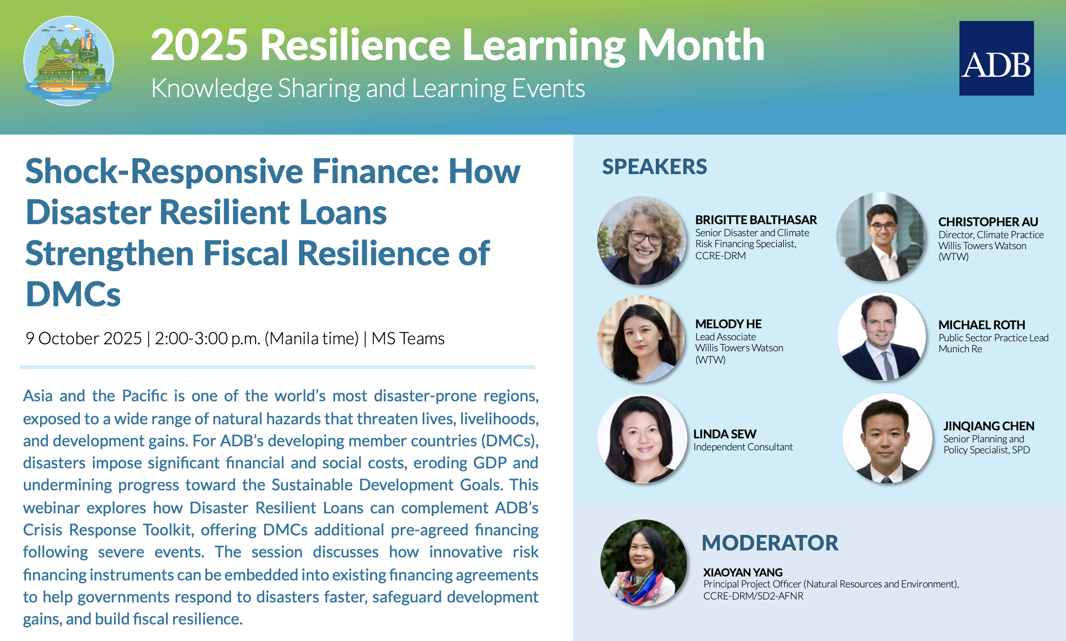 Shock-Responsive Finance: How Disaster Resilient Loans Strengthen Fiscal Resilience of DMC Asia and the Pacific is one of the world’s most disaster-prone regions, exposed to a wide range of natural hazards that threaten lives, livelihoods, and development gains. For ADB’s developing member countries (DMCs), disasters impose significant financial and social costs, eroding GDP and undermining progress toward the Sustainable Development Goals. This session explored how Disaster Resilient Loans can complement ADB’s Crisis Response Toolkit, offering DMCs additional pre-agreed financing following severe events. Read: Event Summary Program and Learning Materials 09 October 2025 Session / Activity Title Speaker(s) Presentation How Disaster Resilient Loans Strengthen Fiscal Resilience of DMCs This presentation explains how Disaster Resilient Loans (DRL) operate as a financing tool to strengthen disaster preparedness and recovery, and how… Christopher Au, Melody He, Michael Roth, Linda Sew Disclaimer The views expressed on this website are those of the authors and do not necessarily reflect the views and policies of the Asian Development Bank (ADB) or its Board of Governors or the governments they represent. ADB does not guarantee the accuracy of the data included in this publication and accepts no responsibility for any consequence of their use. By making any designation of or reference to a particular territory or geographic area, or by using the term “country” in this document, ADB does not intend to make any judgments as to the legal or other status of any territory or area. Event Coordinator/s Jonathan Austria ADB Organizer/s Climate Change, Resilience, and Environment Cluster Climate Change and Sustainable Development Topics Climate Change Disaster Risk Management Environment