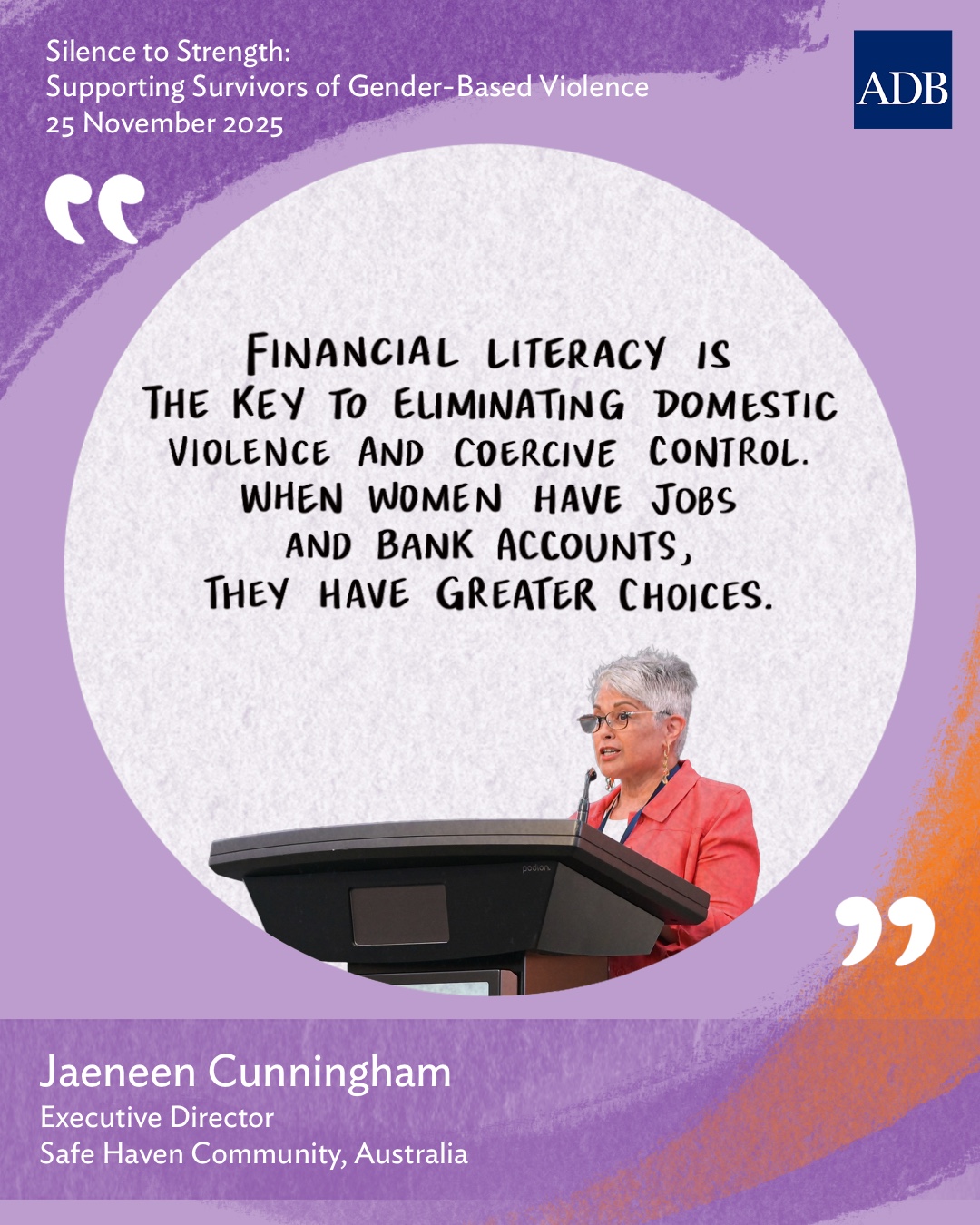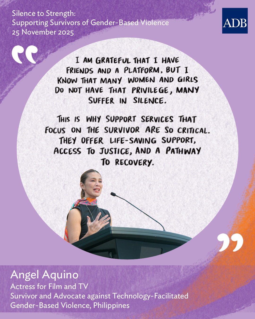 Silence to Strength: Supporting Survivors of Gender-Based Violence - A Panel Discussion to Commemorate the International Day for the Elimination of Violence against Women (IDEVAW) 25 November 2025 The International Day for the Elimination of Violence against Women (IDEVAW) is commemorated annually on 25 November, the first day of the global campaign of 16 days of activism against violence against women. Violence against women remains a serious issue across Asia and the Pacific. The impact on the lives of survivors is grave. Their families and communities are also affected, decreasing productivity and placing economic burden on health, social, and justice services, and ultimately, development and progress. The numbers are staggering – the UN reports that globally, one woman or girl is killed every 10 minutes by an intimate partner or family member. In Asia and the Pacific, 3 in 4 women have experienced sexual harassment. ADB Strategy 2030 Midterm Review’s Pillar on Resilience and Empowerment recognizes that intersecting crises have affected women and girls disproportionately and that there are alarming regional trends including higher rates of gender-based violence. While efforts to address and prevent violence against women have increased over the years in the region, prevalence rates remain high, and support services have had to diversify their approach to find pathways for initial support and economic empowerment of survivors and their families. Frontline services have played a pivotal role in raising and amplifying awareness not only on the elements of violence against women but also on the importance of tailored crisis and recovery responses for survivors. Support services and referral pathways remain a key partner for ADB as they provide a critical service not just for project-affected communities and government agencies but also for project management units and contractors. This year, ADB commemorated IDEVAW with various experts who discussed the work of key support services and engaging with survivors using a survivor-centered approach. The panel discussion explored how resources are mobilized and what a survivor-centered approach could mean for ADB operations. Objectives Strengthen understanding of the dynamics of violence against women and the challenges in the provision of survivor support Identify models of survivor-centered approach support and innovative approaches towards empowerment Build understanding of opportunities for embedding a survivor-centered approach through the private sector Build understanding and awareness of the role of internal justice systems in the support for survivors Program and Learning Materials 25 November 2025 Session / Activity Title Speaker(s) 2:00–2:10 p.m. Introduction and Welcome Samantha Hung, Director, Gender Equality, ADB 2:00–2:10 p.m. Opening Remarks Yevgeniy Zhukov, Director General, Climate Change and Sustainable Development Department, ADB 2:10–2:50 p.m. Panel Discussion 2:10–2:50 p.m. Moderator: Samantha Hung, Director, Gender Equality, ADB Panelists Diana Camacho-Mercado, Assistant Secretary, Department of Budget and Management (DBM), Philippines Jaeneen Cunningham, Executive Director, Safe Haven Community Australia Evonne Kennedy, Executive Director, Business Coalition for Women, Papua New Guinea (PNG), and Board Member of Bel Isi PNG. Angel Aquino, Actress for Film and TV, Survivor and Advocate against Technology-Facilitated GBV, Philippines Davide Marzano, Director, Office of Professional Ethics and Conduct, ADB 2:50–2:55 p.m. Question and Answer 2:55–3:00 p.m. Closing Remarks Samantha Hung, Director, Gender Equality, ADB Disclaimer The views expressed on this website are those of the authors and do not necessarily reflect the views and policies of the Asian Development Bank (ADB) or its Board of Governors or the governments they represent. ADB does not guarantee the accuracy of the data included in this publication and accepts no responsibility for any consequence of their use. By making any designation of or reference to a particular territory or geographic area, or by using the term “country” in this document, ADB does not intend to make any judgments as to the legal or other status of any territory or area. Event Coordinator/s Edwina Kotoisuva ADB Organizer/s Gender Equality Division Read Also Agenda and Event Background [ADB Publication] Survivor-Centered Digital Solutions for Preventing and Responding to GBV/SEAH [2024 IDEVAW] Transforming Masculinities to End Gender-Based Violence [LinkedIn] Data on violence against women [LinkedIn] Ending violence against women is now [LinkedIn] Photo Highlights [LinkedIn] Angel Aquino speaks about IDEVAW Topics Gender Equality