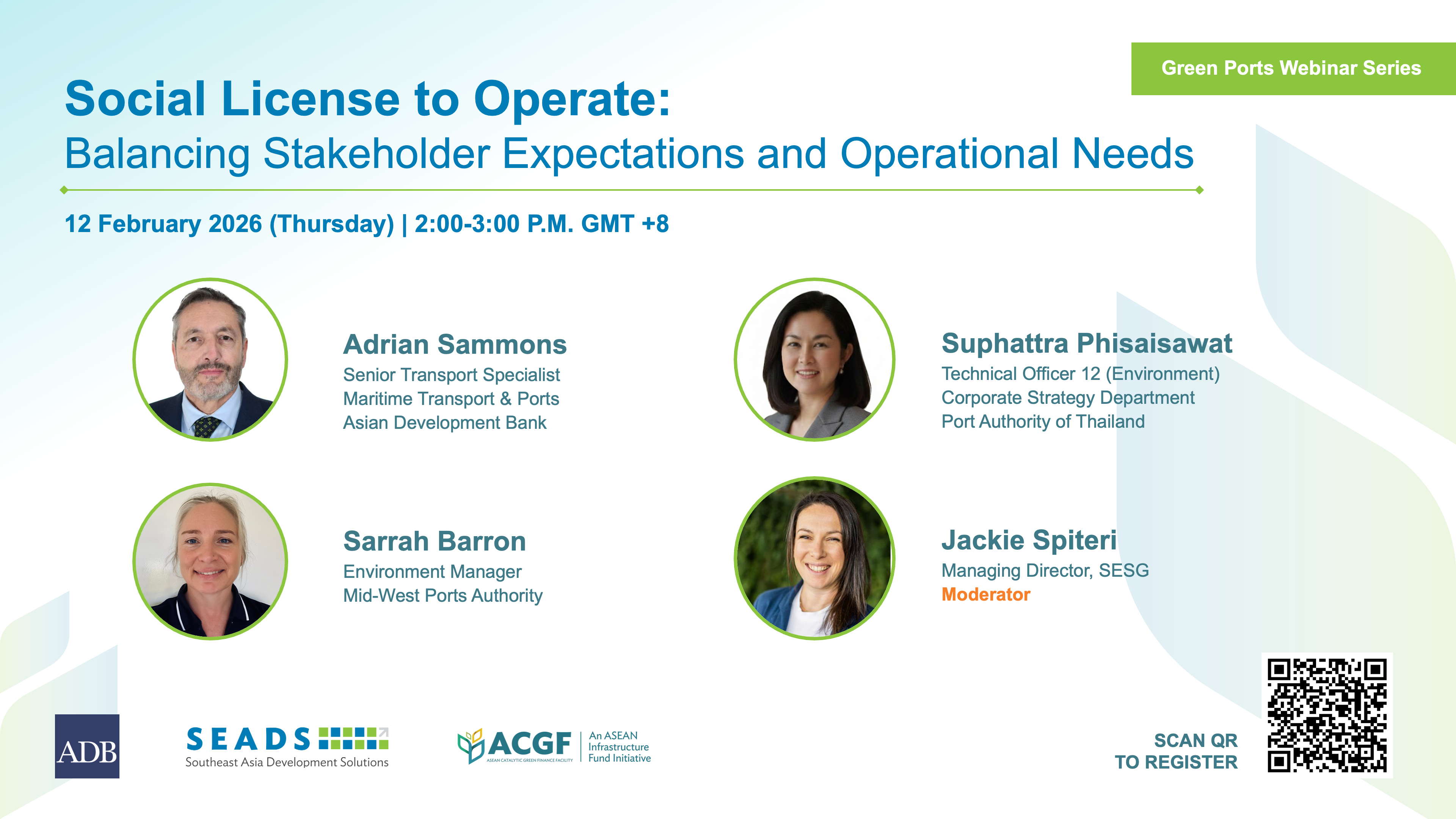 Social License to Operate: Balancing Stakeholder Expectations and Operational Needs 12 February 2026 Ports are the backbone of global trade, handling around 80% of the world’s goods by volume. In Southeast Asia, where economies are highly trade-dependent, and ports are closely linked to urban and coastal communities, port activities also concentrate environmental and social pressures. As scrutiny of ecological and social practices, human rights, transparency, and community impacts increases, a port’s ability to operate and grow depends more and more on its social license to operate—the trust and acceptance of port users, communities, regulators, investors, and markets. This is particularly relevant in Southeast Asia, where ports face rising expectations from regional regulators, financiers, and global supply chains to demonstrate responsible environmental, social, and governance performance. As global markets demand cleaner, fairer, and more transparent supply chains, ports in the region are no longer assessed solely on efficiency and cost. Understanding what matters most to stakeholders and identifying what material is critical for managing reputational and operational risks, maintaining competitiveness, and securing access to capital. The session will combine a focused presentation with regional insights, an international case study, and a facilitated discussion, providing practical guidance for ASEAN ports on identifying material sustainability issues and strengthening their social license. This webinar is the third in the Green Ports Webinar series organized by the ASEAN Catalytic Green Finance Facility (ACGF), which is managed by the ASEAN Power Grid and Special Funds Unit of ADB's Southeast Asia Regional Department. It is hosted by ADB’s Southeast Asia Development Solutions (SEADS) platform. ACGF is an ASEAN Infrastructure Fund initiative supporting governments in Southeast Asia to prepare and finance infrastructure projects that promote environmental sustainability and contribute to climate change goals. ACGF is owned by ASEAN governments and ADB. Program and Learning Materials 12 February 2026 Session / Activity Title Speaker(s) Materials will be uploaded once available after the event. Disclaimer The views expressed on this website are those of the authors and do not necessarily reflect the views and policies of the Asian Development Bank (ADB) or its Board of Governors or the governments they represent. ADB does not guarantee the accuracy of the data included in this publication and accepts no responsibility for any consequence of their use. By making any designation of or reference to a particular territory or geographic area, or by using the term “country” in this document, ADB does not intend to make any judgments as to the legal or other status of any territory or area. Event Coordinator/s Adrian Sammons ACGF Knowledge Team ADB Organizer/s Southeast Asia Department Read Also ASEAN Infrastructure Fund (Parent organization of ACGF) Partner Organization/s SESG Mid-West Ports Authority Port Authority of Thailand Topics Regional Cooperation and Integration