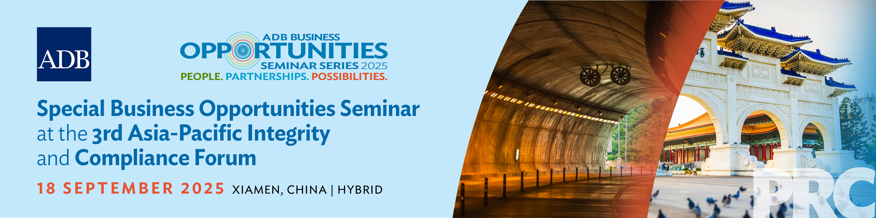 Series: ADB Business Outreach Activities Special Business Opportunities Seminar at the 3rd Asia-Pacific Integrity and Compliance Forum 18 September 2025 ADB undertakes Business Opportunities Seminars (BOSs) for its members to improve the interest and ability of eligible suppliers to locate ADB business opportunities, prepare high-quality and responsive bids, and understand ADB’s procurement and anticorruption procedures. These activities benefit ADB-financed projects in its developing member countries by enhancing competition for contracts and partnerships, and promoting higher-quality market offers that deliver optimal value for money. Program and Learning Materials 18 September 2025 Session / Activity Title Speaker(s) Portfolios and Pipelines/Recent Developments on the Procurement Policies of Multilateral Development Banks ADB Business Opportunity Pipelines (2025–2026) The presentation provided an overview of ADB’s project pipeline for 2025–2026, highlighting sector priorities, regional distribution, and thematic… Minhong Fan Portfolios and Pipelines/Recent Developments on the Procurement Policies of Multilateral Development Banks ADB Business Opportunities This presentation gives an overview of ADB's business opportunities and procurement framework and policy. Minhong Fan Portfolios and Pipelines/Recent Developments on the Procurement Policies of Multilateral Development Banks Working with the World Bank The presentation outlined the World Bank’s strategic priorities, operational approaches, and financing instruments supporting sustainable development… Yuan Wang Portfolios and Pipelines/Recent Developments on the Procurement Policies of Multilateral Development Banks Doing Business with AIIB The presentation discussed AIIB’s strategic focus, operational priorities, and evolving project pipeline. It highlighted investments in sustainable… Guoping Yu Disclaimer The views expressed on this website are those of the authors and do not necessarily reflect the views and policies of the Asian Development Bank (ADB) or its Board of Governors or the governments they represent. ADB does not guarantee the accuracy of the data included in this publication and accepts no responsibility for any consequence of their use. By making any designation of or reference to a particular territory or geographic area, or by using the term “country” in this document, ADB does not intend to make any judgments as to the legal or other status of any territory or area. Event Coordinator/s Marie Charmaine Yuson Clarissa Santos Jhoanna Quimson Related Full Agenda ADB Organizer/s Procurement, Portfolio, and Financial Management Department Read Also Business Opportunities Outreach Website MAIN PAGE: ADB Business Outreach Activities ADB Business Center ADB Business Center LinkedIn Photo Gallery Topics ADB Administration and Governance Finance