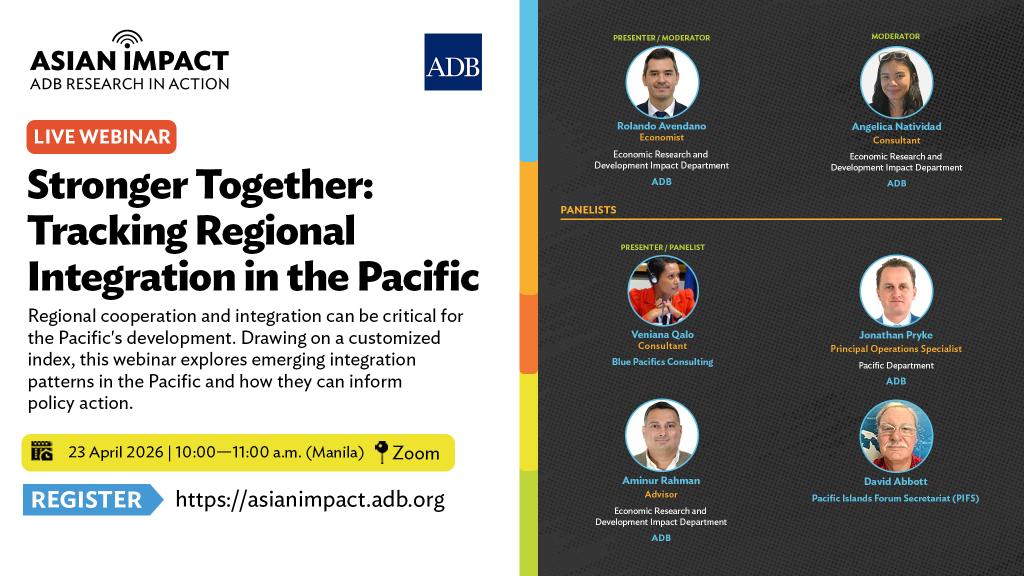 Stronger Together: Tracking Regional Integration in the Pacific 23 April 2026 Regional Cooperation and Integration is, and will be, central to the Pacific’s development pathways. This webinar presents a customized version of the Asia Pacific Regional Cooperation and Integration Index (ARCII) tailored to Pacific developing member countries (DMCs). It assesses the subregion’s economic linkages with Asia, within its members, and with key external partners across multiple channels, including trade, investment, infrastructure and digital connectivity. The report concludes with policy recommendations to inform key regional strategies and the Pacific Roadmap for Economic Development. Program and Learning Materials 23 April 2026 Session / Activity Title Speaker(s) For more information, click here. Disclaimer The views expressed on this website are those of the authors and do not necessarily reflect the views and policies of the Asian Development Bank (ADB) or its Board of Governors or the governments they represent. ADB does not guarantee the accuracy of the data included in this publication and accepts no responsibility for any consequence of their use. By making any designation of or reference to a particular territory or geographic area, or by using the term “country” in this document, ADB does not intend to make any judgments as to the legal or other status of any territory or area. Event Coordinator/s Maria Melissa Gregorio-Dela Paz ADB Organizer/s Economic Research and Development Impact Department Read Also Main Page: ADB Asian Impact Asian Impact Series Website ADB Event Webpage Regional Cooperation and Integration (RCI) Topics Economics Regional Cooperation and Integration
