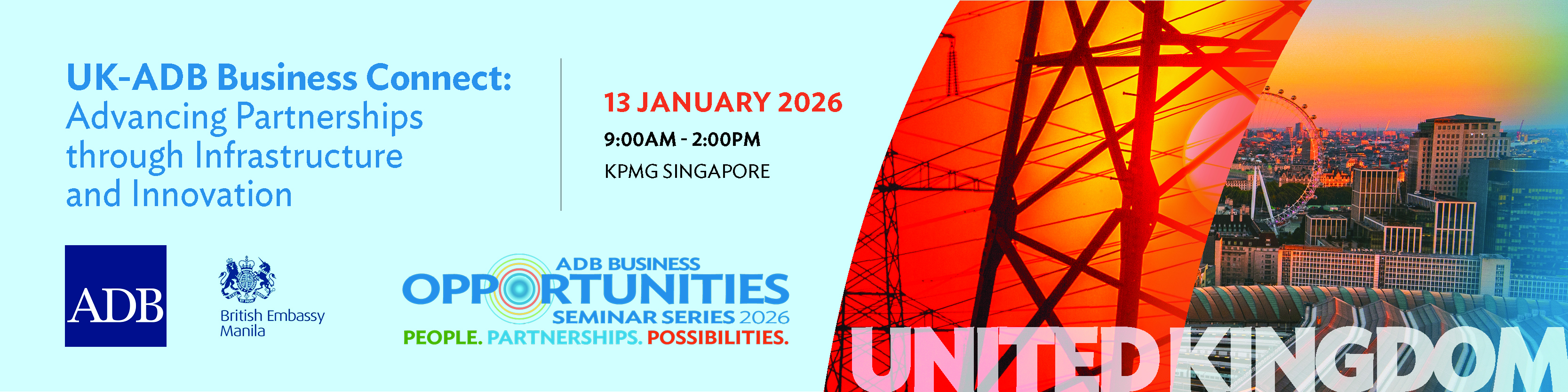 UK-ADB Business Connect: Advancing Partnerships through Infrastructure and Innovation 13 January 2026 Singapore ADB undertakes Business Opportunities Seminars (BOSs) in its members to improve the interest and ability of eligible suppliers to locate ADB business opportunities, prepare high-quality and responsive bids, and understand ADB’s procurement and anticorruption procedures. These activities benefit ADB-financed projects in its developing member countries by enhancing competition for contracts and partnerships, and promoting higher-quality market offers that deliver optimal value for money. Program and Learning Materials 13 January 2026 Session / Activity Title Speaker(s) Presentations ASEAN Power Grid: Regional Integration and Connectivity This gives an overview of the ASEAN Power Grid: Regional Integration and Connectivity. Len George, Architrandi Priambodo Presentations ADB Trade and Supply Chain Finance Program (TSCFP) This gives an overview of the ADB Trade and Supply Chain Finance Program (TSCFP) and its mandate. Tristan Knowles, Steven Beck Presentations ADB’s 2026 Procurement Reform: Improving Quality and Enhancing Value for Money Outcomes This gives an overview of the ADB’s 2026 Procurement Reform and its objectives. Kevin Moore Presentations Mobilising Investment Across the Capital Structure This gives an overview of the PIDG’s approach to investing. Shilpa Krishnan Disclaimer The views expressed on this website are those of the authors and do not necessarily reflect the views and policies of the Asian Development Bank (ADB) or its Board of Governors or the governments they represent. ADB does not guarantee the accuracy of the data included in this publication and accepts no responsibility for any consequence of their use. By making any designation of or reference to a particular territory or geographic area, or by using the term “country” in this document, ADB does not intend to make any judgments as to the legal or other status of any territory or area. Event Coordinator/s Marie Charmaine Yuson Clarissa Santos Jhoanna Quimson Related Full Agenda ADB Organizer/s Procurement, Portfolio, and Financial Management Department Read Also Business Opportunities Outreach Website MAIN PAGE: ADB Business Outreach Activities ADB Business Center ADB Business Center LinkedIn Photo Gallery Topics ADB Administration and Governance Finance