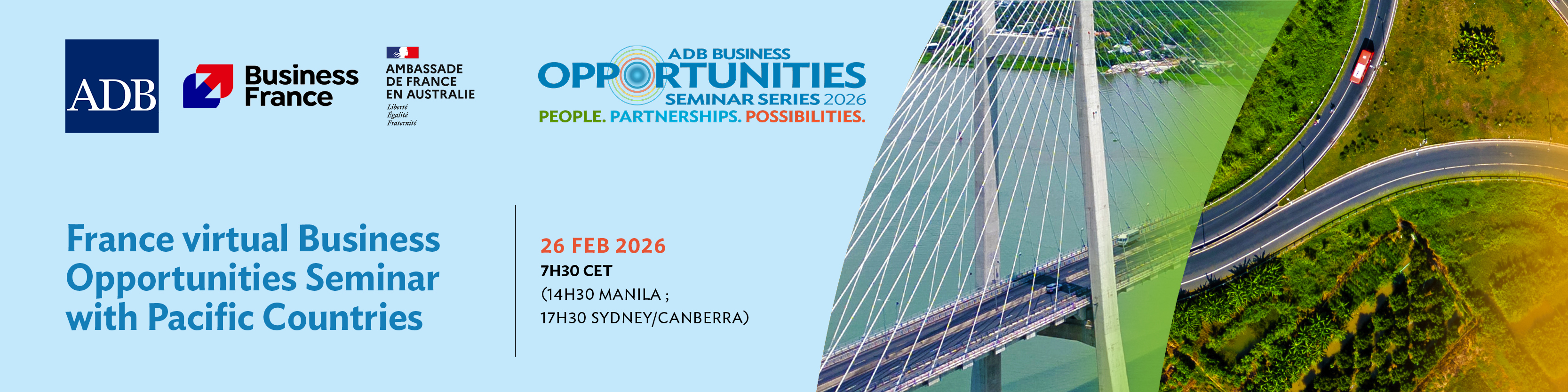 Series: ADB Business Outreach Activities Virtual Business Opportunities Seminar for French companies working in the Pacific 26 February 2026 2:30 – 4:00 PM (GMT+8) ADB undertakes Business Opportunities Seminars (BOSs) for its members to improve the interest and ability of eligible suppliers to locate ADB business opportunities, prepare high-quality and responsive bids, and understand ADB’s procurement and anticorruption procedures. Objectives During the event, participants will have the opportunity to: meet virtually with ADB staff in procurement, consulting, project management, and related operations. hear presentations on how to qualify for ADB-financed contracts. discover what business opportunities are available and where. At the end of the event, participants will have: discovered the advantages of ADB-financed contracts. received an inside look at ADB's policies and procedures for the procurement of goods and works, the recruitment of consultants. learned how to locate business opportunities. learned the best ways to prepare responsive bids and proposals. received first-hand information on contracting opportunities by sector currently available under ongoing ADB-financed projects, and upcoming ADB pipeline projects. Program and Learning Materials 26 February 2026 Session / Activity Title Speaker(s) Materials will be uploaded once available after the event. Disclaimer The views expressed on this website are those of the authors and do not necessarily reflect the views and policies of the Asian Development Bank (ADB) or its Board of Governors or the governments they represent. ADB does not guarantee the accuracy of the data included in this publication and accepts no responsibility for any consequence of their use. By making any designation of or reference to a particular territory or geographic area, or by using the term “country” in this document, ADB does not intend to make any judgments as to the legal or other status of any territory or area. Event Coordinator/s Marie Charmaine Yuson Clarissa Santos Jhoanna Quimson ADB Organizer/s Procurement, Portfolio, and Financial Management Department Read Also Business Opportunities Outreach Website MAIN PAGE: ADB Business Outreach Activities ADB Event Webpage ADB Business Center ADB Business Center LinkedIn Topics ADB Administration and Governance Finance