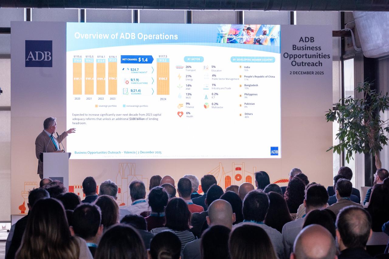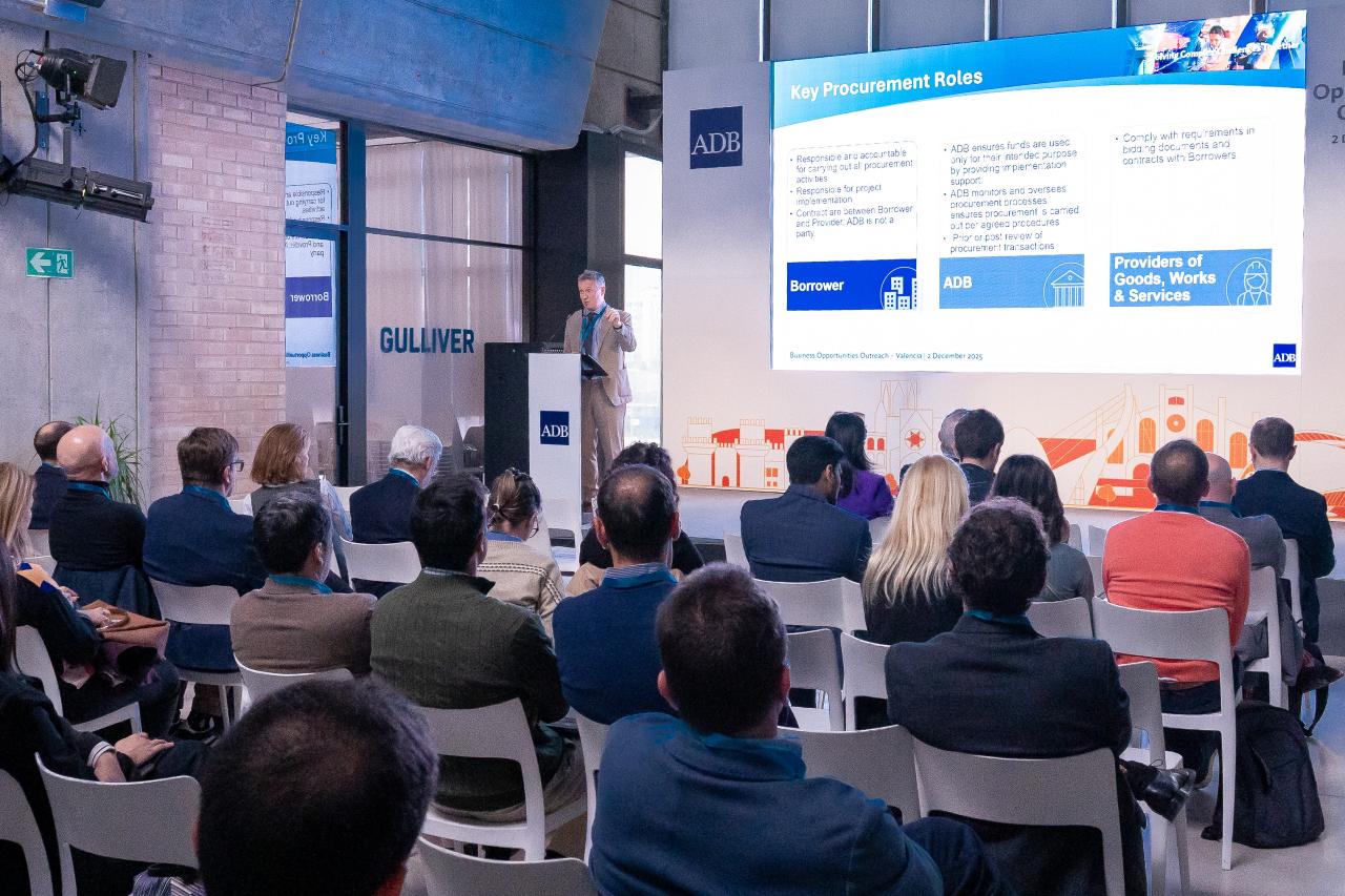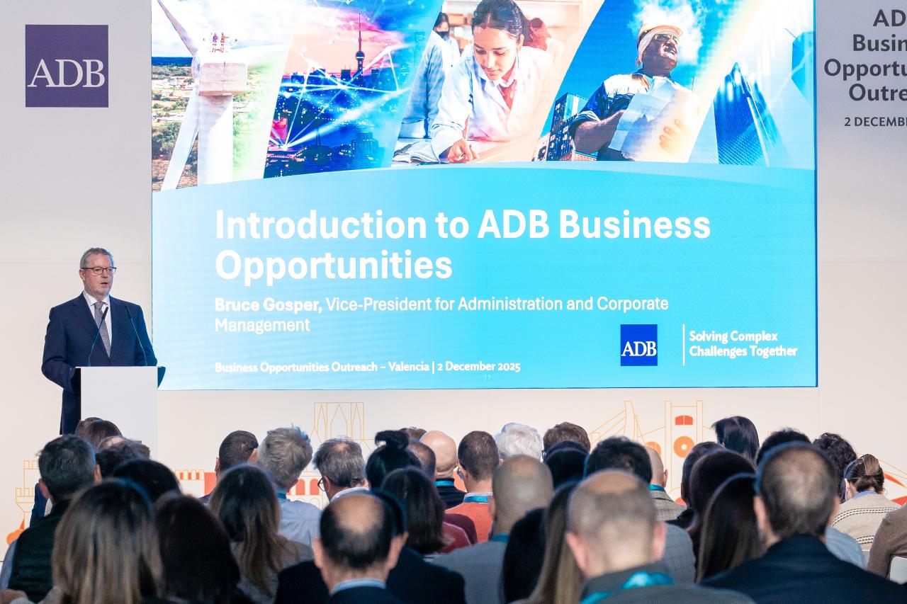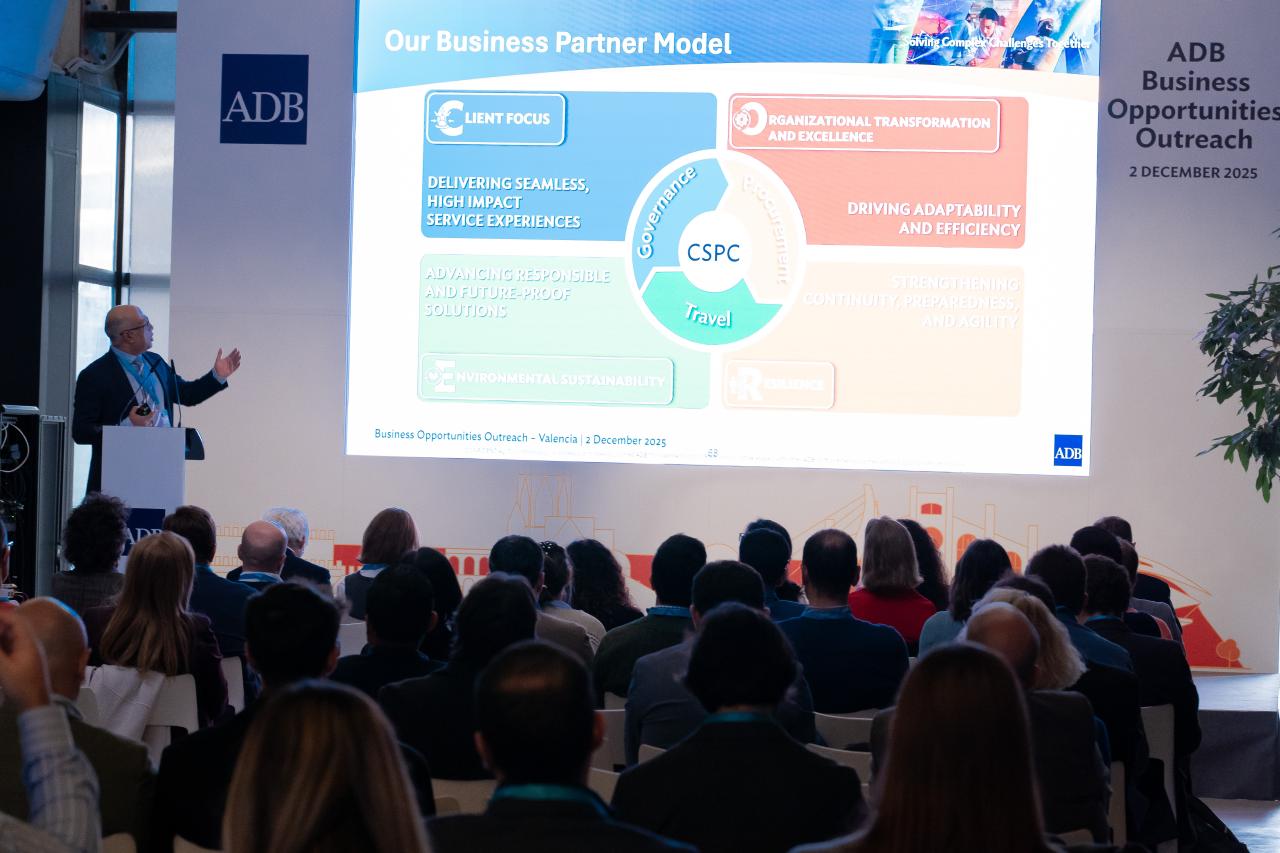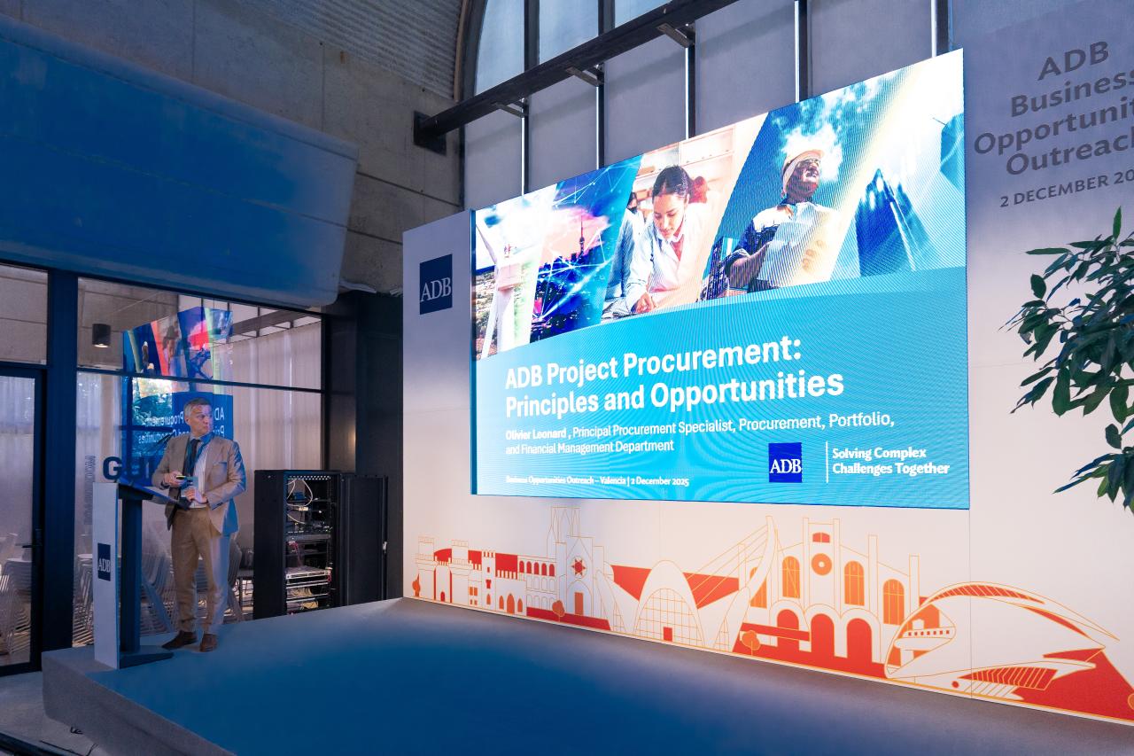 Event: ADB Business Opportunities Seminar in Valencia, Spain Photo Gallery: ADB Business Opportunities Seminar in Valencia, Spain 02 December 2025 Photos from the ADB Business Opportunities Seminar in Valencia, Spain Disclaimer The views expressed on this website are those of the authors and do not necessarily reflect the views and policies of the Asian Development Bank (ADB) or its Board of Governors or the governments they represent. ADB does not guarantee the accuracy of the data included in this publication and accepts no responsibility for any consequence of their use. By making any designation of or reference to a particular territory or geographic area, or by using the term “country” in this document, ADB does not intend to make any judgments as to the legal or other status of any territory or area. Topics ADB Administration and Governance ICT Industry and Trade Private Sector Public-Private Partnership