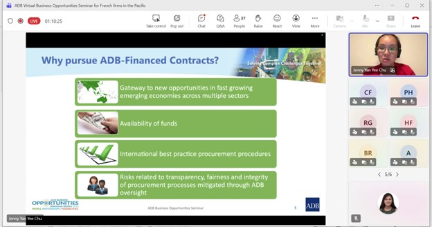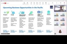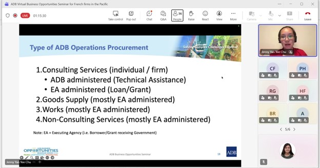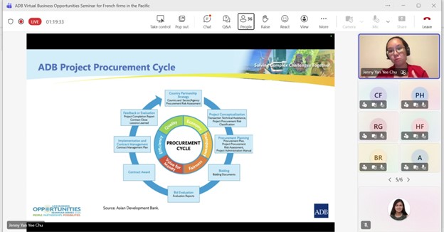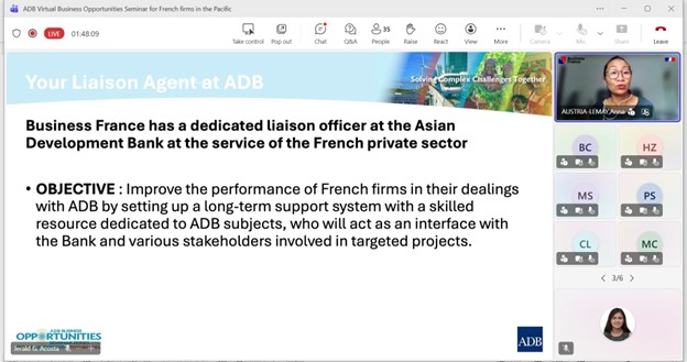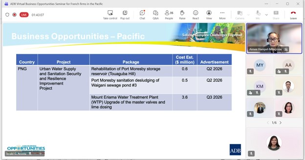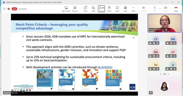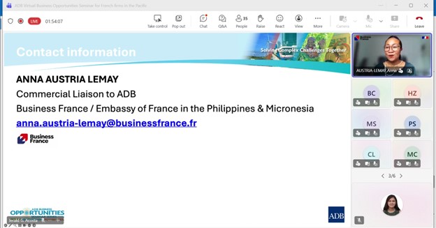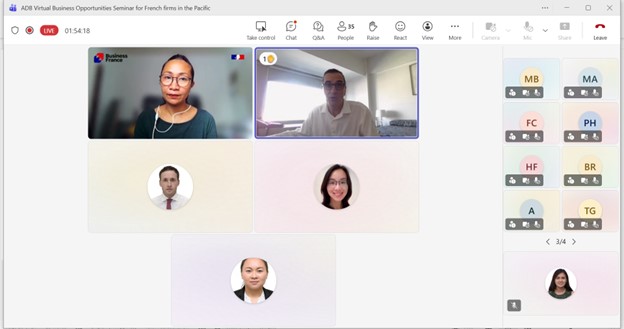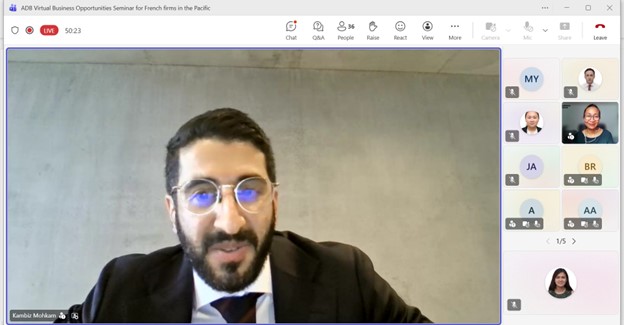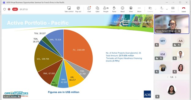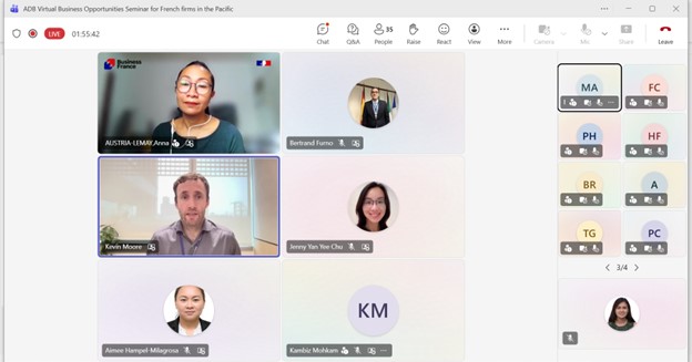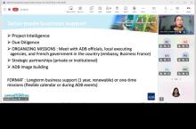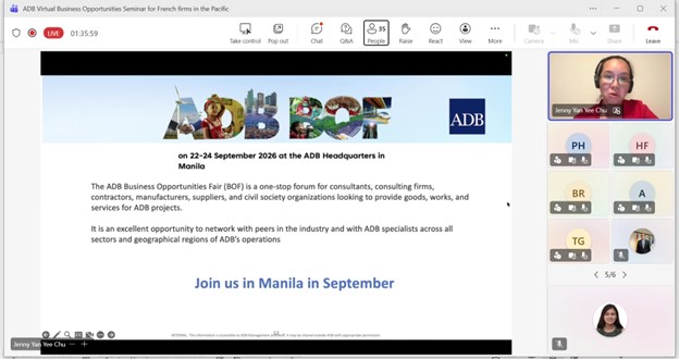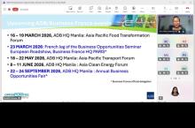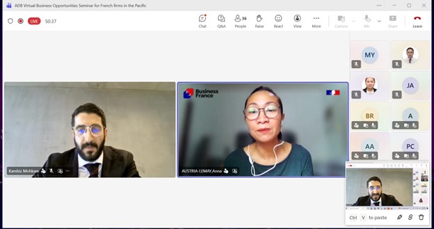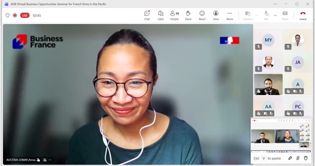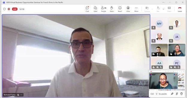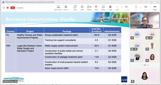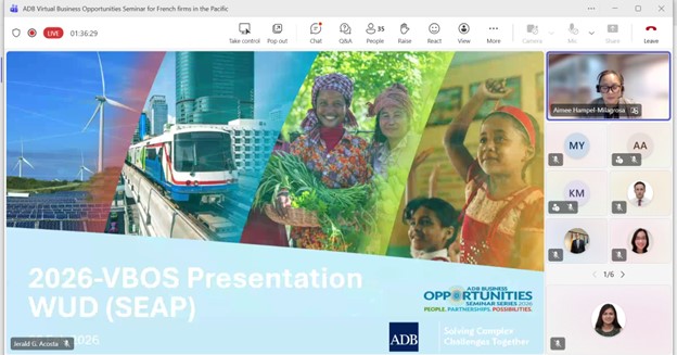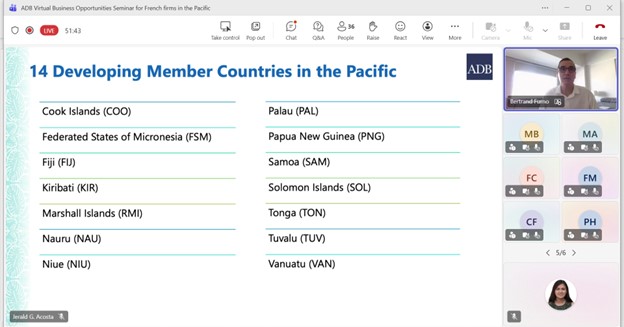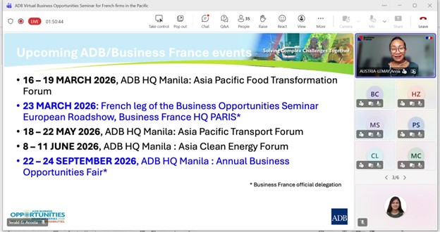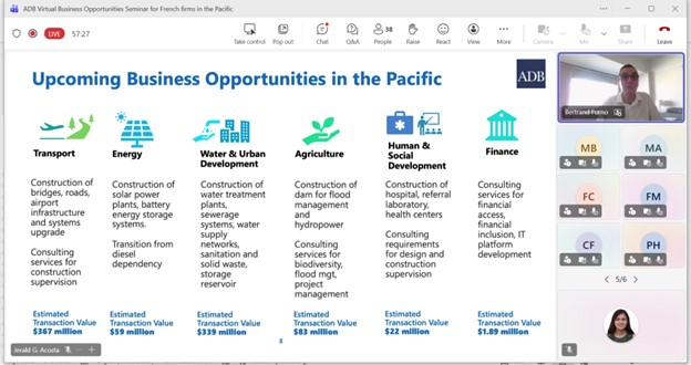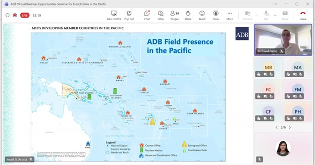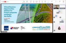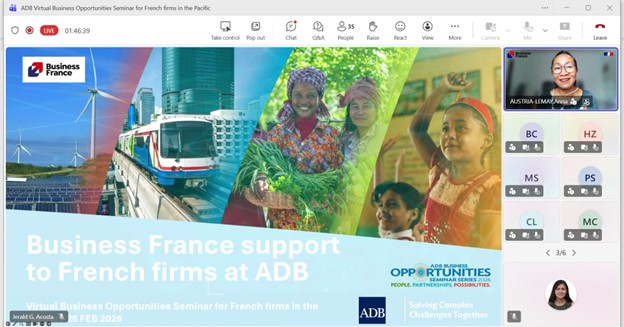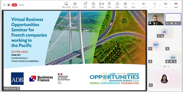 Event: Virtual Business Opportunities Seminar for French companies working in the Pacific Photo Gallery: Virtual Business Opportunities Seminar for French companies working in the Pacific 26 February 2026 Photos from the Virtual Business Opportunities Seminar for French companies working in the Pacific Disclaimer The views expressed on this website are those of the authors and do not necessarily reflect the views and policies of the Asian Development Bank (ADB) or its Board of Governors or the governments they represent. ADB does not guarantee the accuracy of the data included in this publication and accepts no responsibility for any consequence of their use. By making any designation of or reference to a particular territory or geographic area, or by using the term “country” in this document, ADB does not intend to make any judgments as to the legal or other status of any territory or area. Topics ADB Administration and Governance Finance