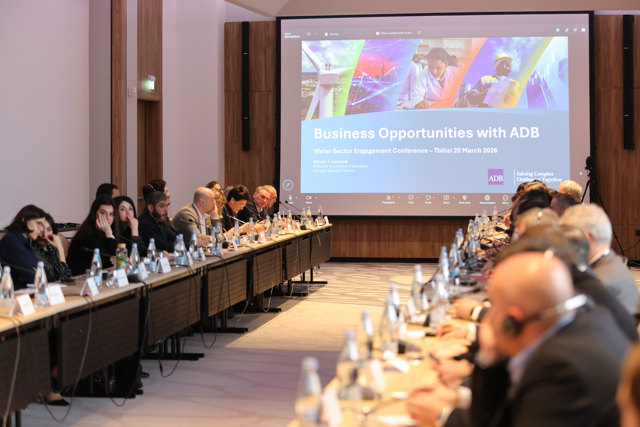 Event: ADB Business Opportunities Seminar (BOS) - Water Sector Engagement Conference in Georgia Photo Gallery: ADB Business Opportunities Seminar (BOS) - Water Sector Engagement Conference in Georgia 19 March 2026 Photos from the ADB Business Opportunities Seminar (BOS) - Water Sector Engagement Conference in Georgia Disclaimer The views expressed on this website are those of the authors and do not necessarily reflect the views and policies of the Asian Development Bank (ADB) or its Board of Governors or the governments they represent. ADB does not guarantee the accuracy of the data included in this publication and accepts no responsibility for any consequence of their use. By making any designation of or reference to a particular territory or geographic area, or by using the term “country” in this document, ADB does not intend to make any judgments as to the legal or other status of any territory or area. Topics ADB Administration and Governance Urban Development Water