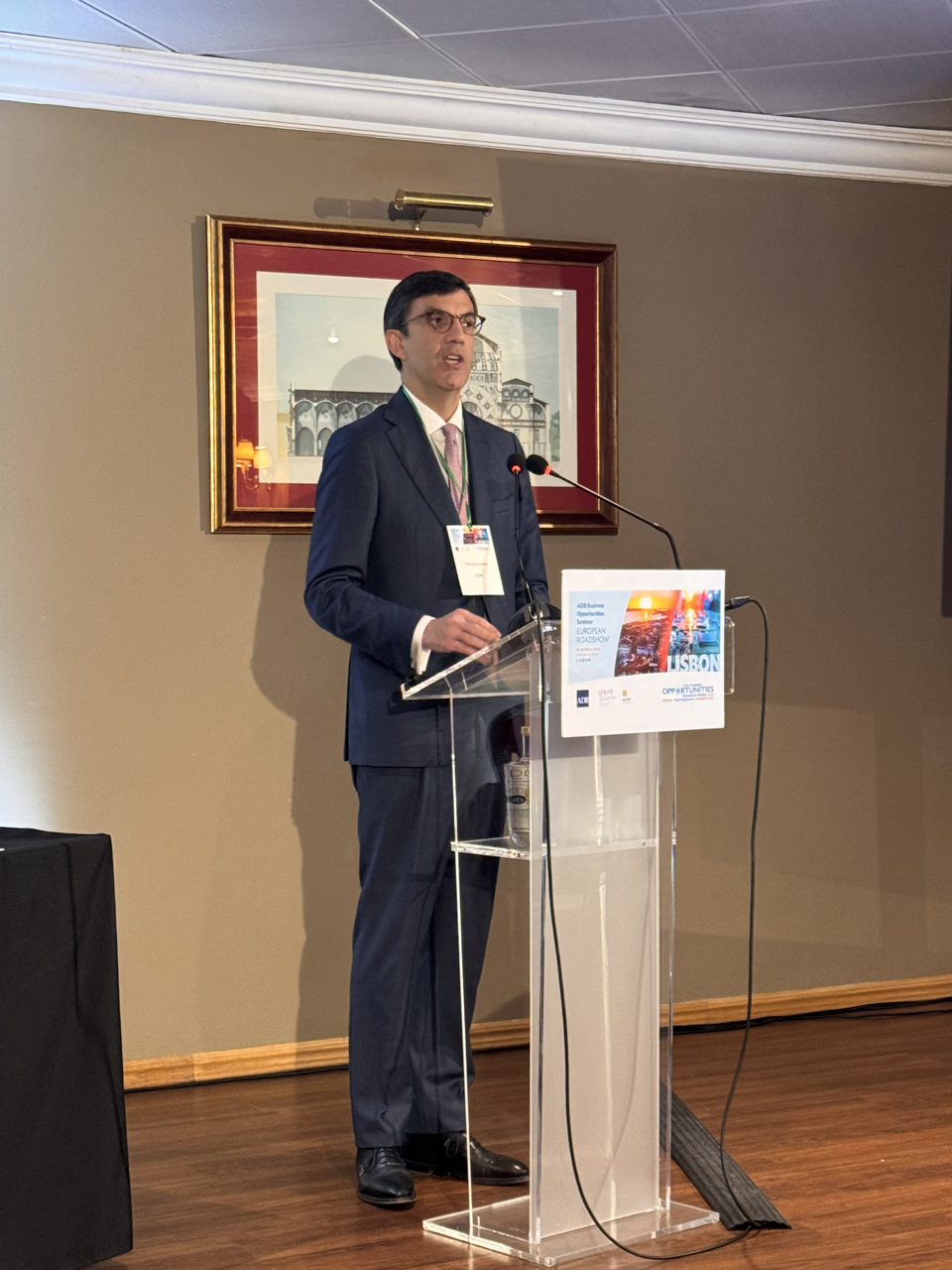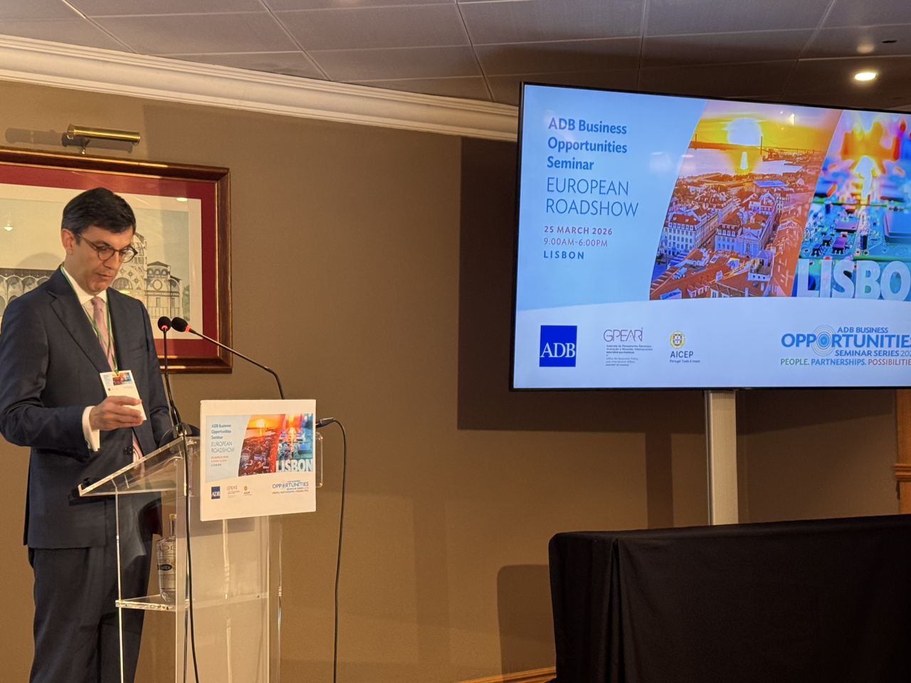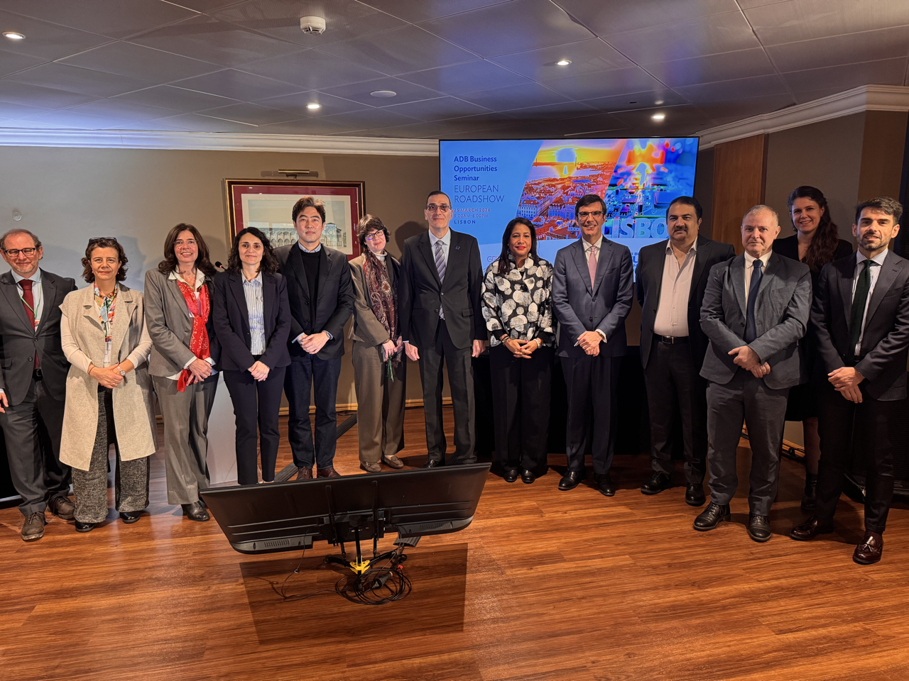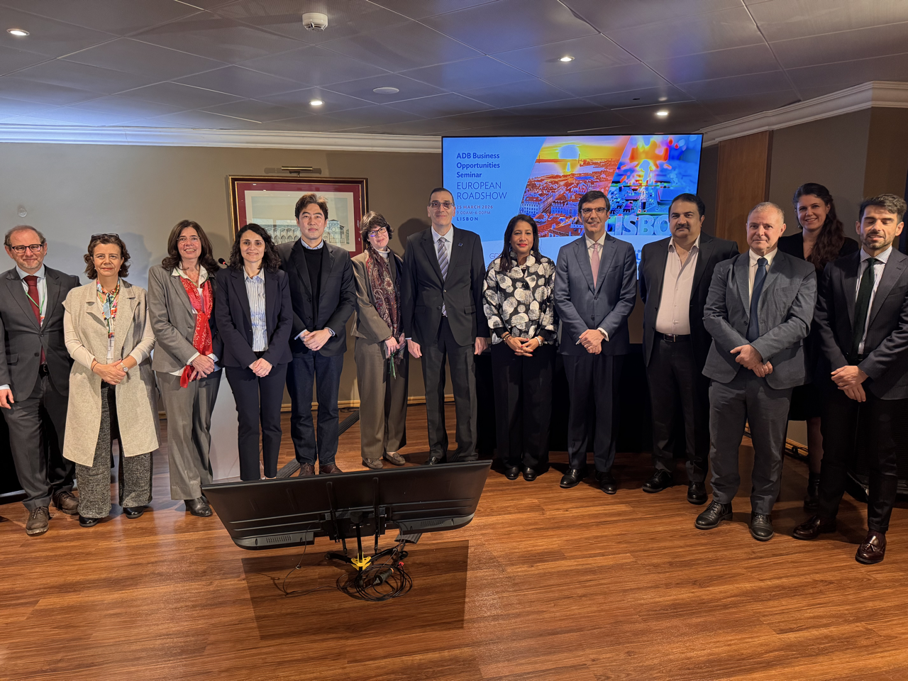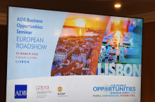 Event: Asian Development Bank’s Business Opportunities Seminar in Lisbon, Portugal (European Roadshow 2026) Photo Gallery: Asian Development Bank’s Business Opportunities Seminar in Lisbon, Asian Development Bank’s Business Opportunities Seminar in Lisbon, Portugal (European Roadshow 2026) 25 March 2026 Photos from the Asian Development Bank’s Business Opportunities Seminar in Lisbon (European Roadshow 2026) Disclaimer The views expressed on this website are those of the authors and do not necessarily reflect the views and policies of the Asian Development Bank (ADB) or its Board of Governors or the governments they represent. ADB does not guarantee the accuracy of the data included in this publication and accepts no responsibility for any consequence of their use. By making any designation of or reference to a particular territory or geographic area, or by using the term “country” in this document, ADB does not intend to make any judgments as to the legal or other status of any territory or area. Topics ADB Administration and Governance Finance