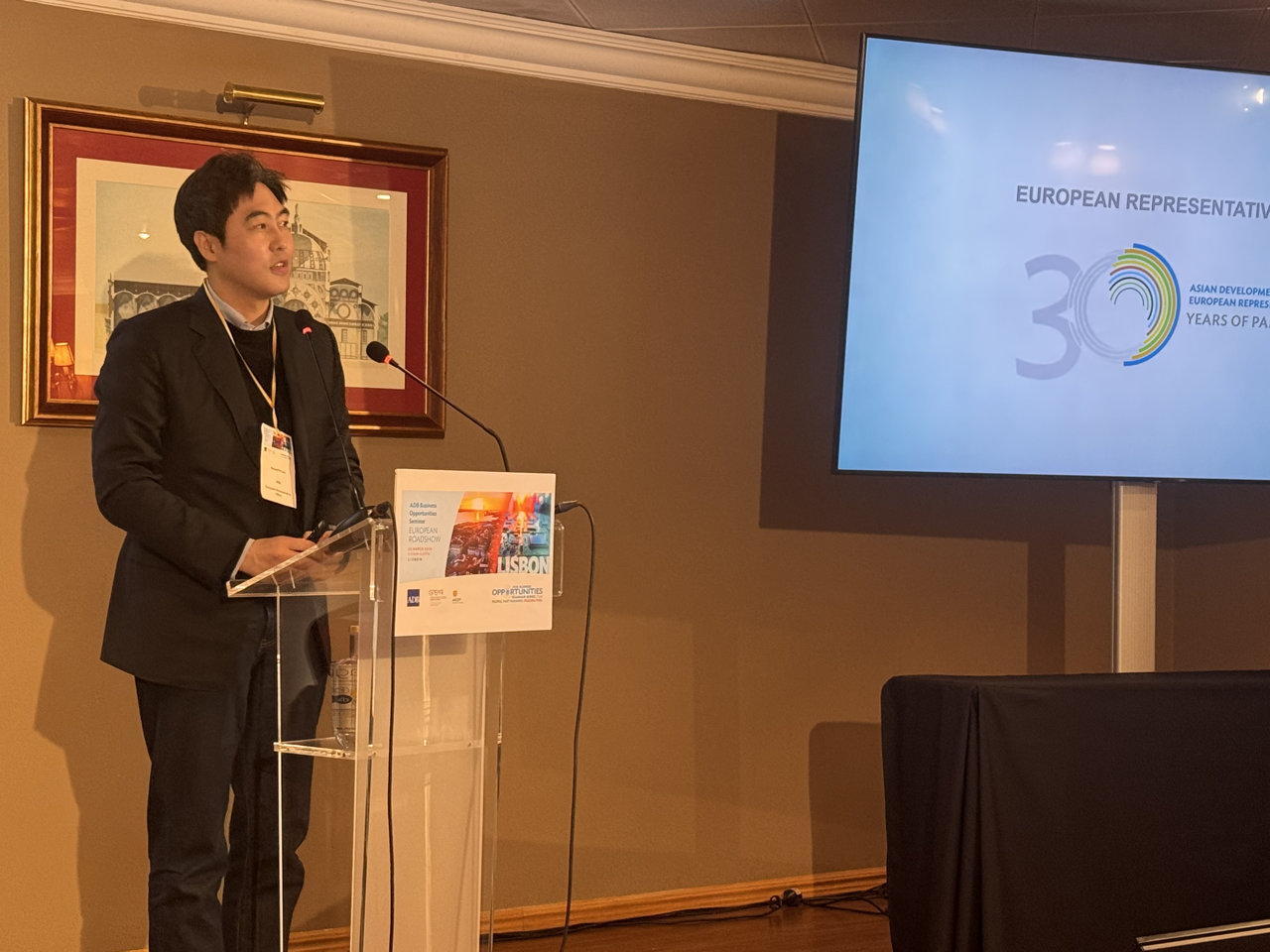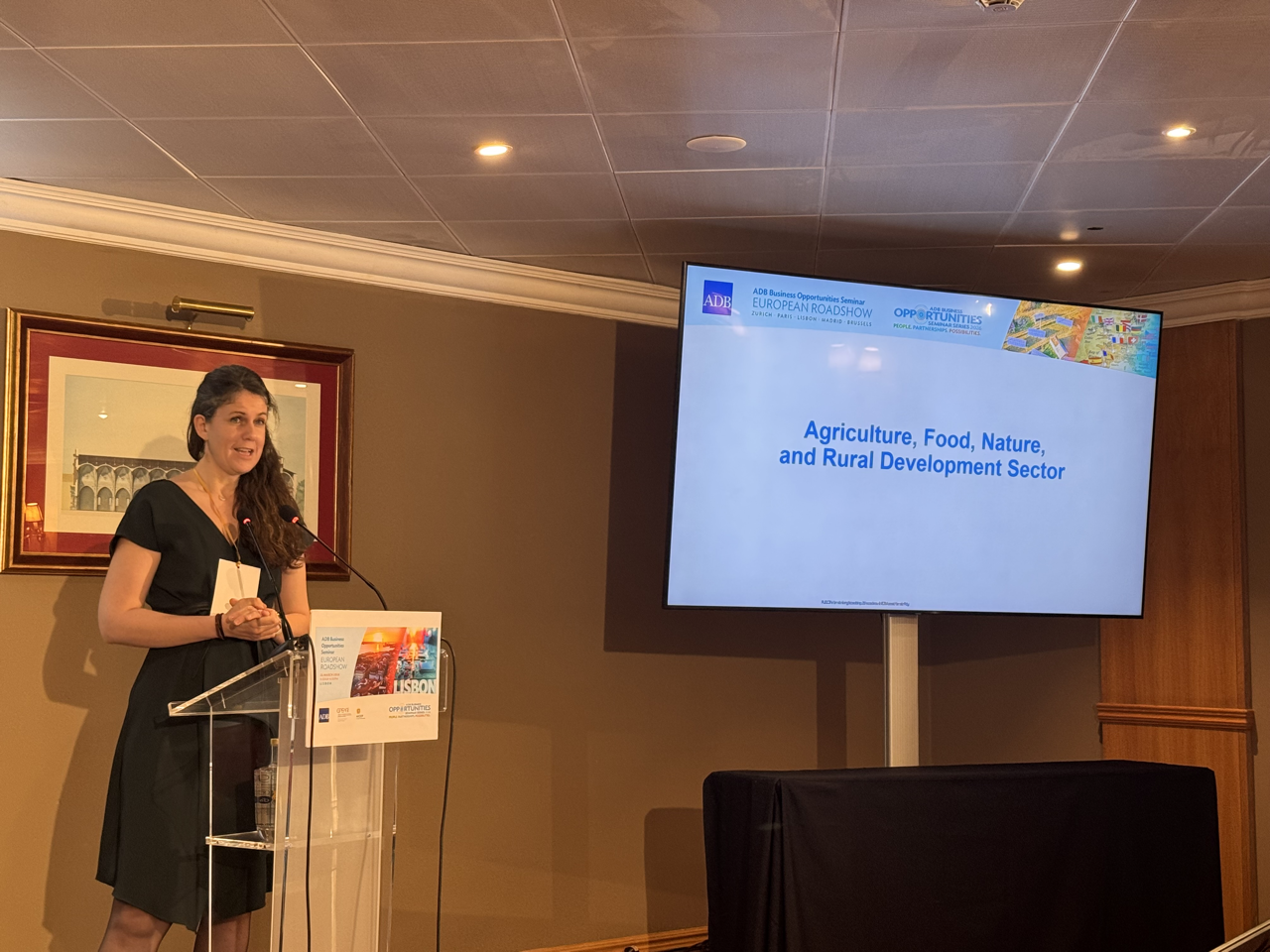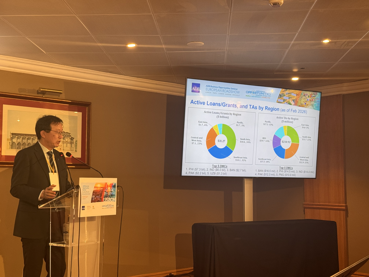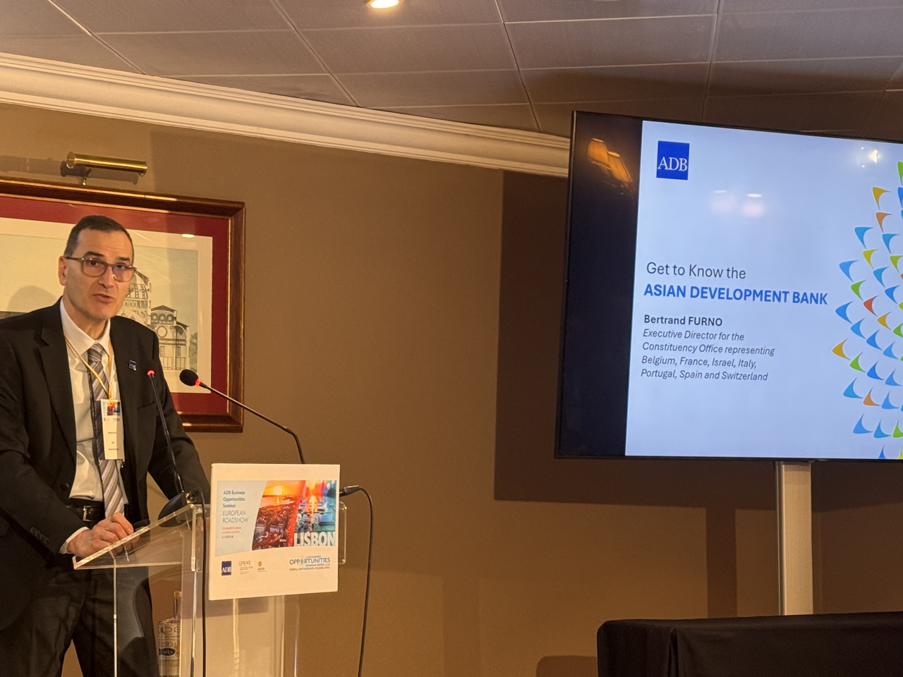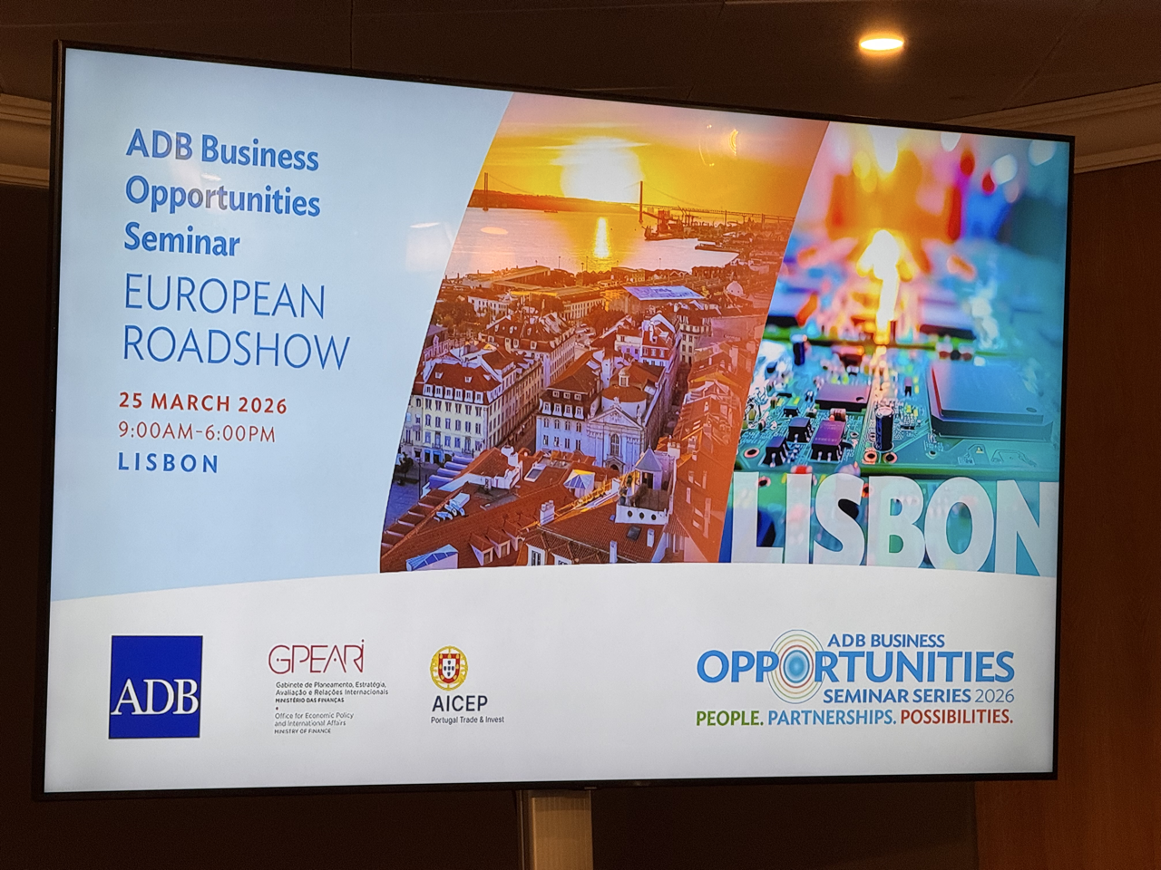 Event: Asian Development Bank’s Business Opportunities Seminar in Lisbon, Portugal (European Roadshow 2026) Photo Gallery: Asian Development Bank’s Business Opportunities Seminar in Lisbon, Asian Development Bank’s Business Opportunities Seminar in Lisbon, Portugal (European Roadshow 2026) 25 March 2026 Photos from the Asian Development Bank’s Business Opportunities Seminar in Lisbon (European Roadshow 2026) Disclaimer The views expressed on this website are those of the authors and do not necessarily reflect the views and policies of the Asian Development Bank (ADB) or its Board of Governors or the governments they represent. ADB does not guarantee the accuracy of the data included in this publication and accepts no responsibility for any consequence of their use. By making any designation of or reference to a particular territory or geographic area, or by using the term “country” in this document, ADB does not intend to make any judgments as to the legal or other status of any territory or area. Topics ADB Administration and Governance Finance