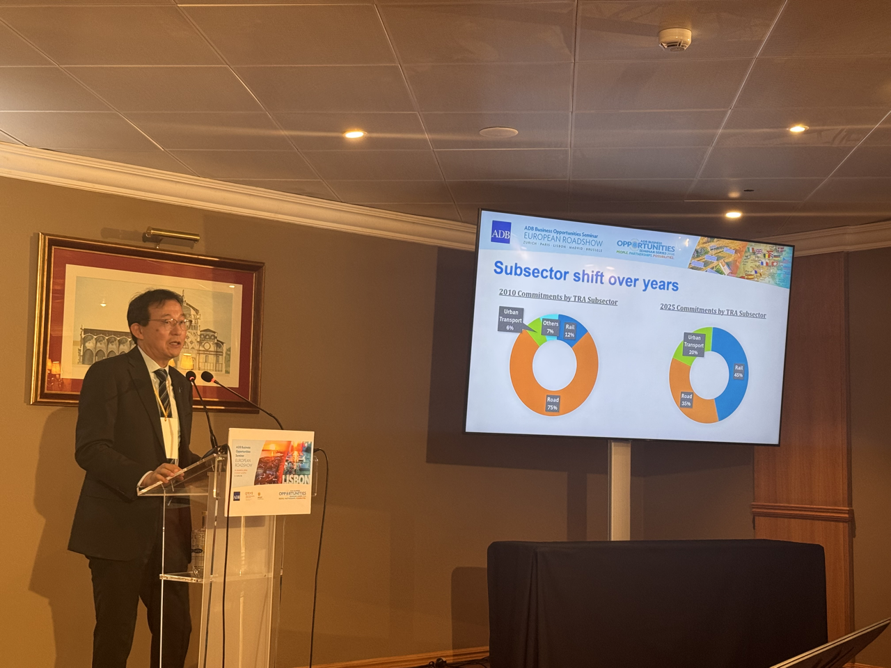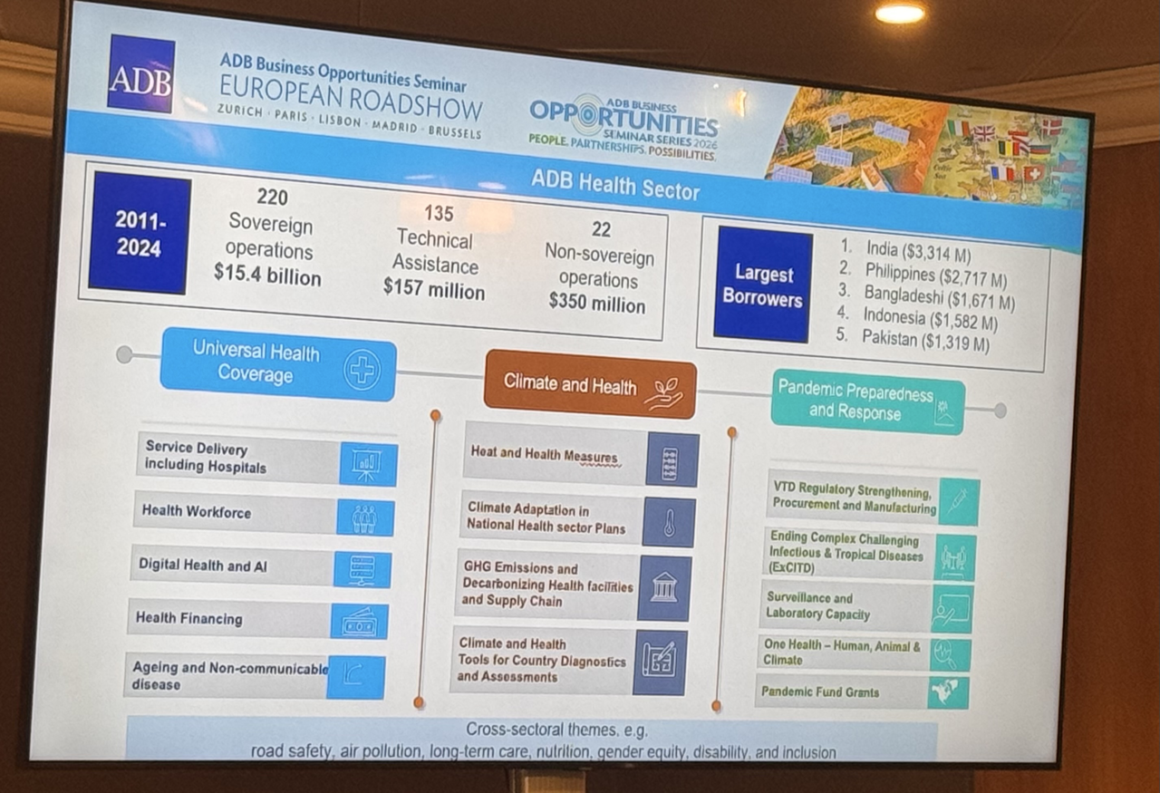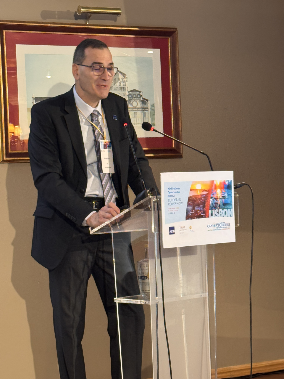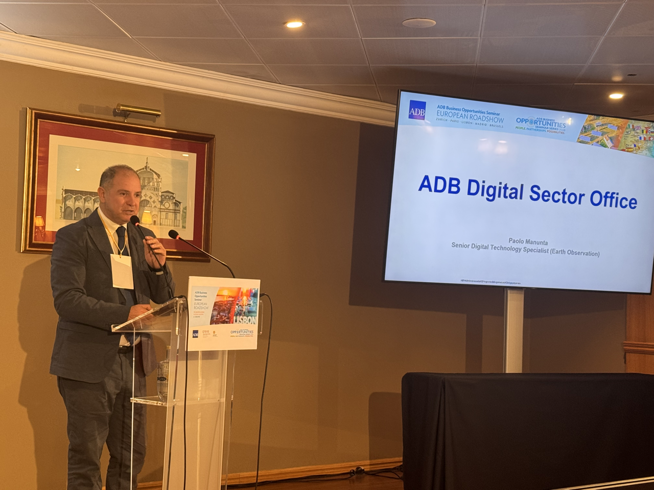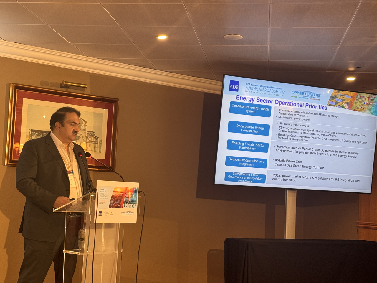 Event: Asian Development Bank’s Business Opportunities Seminar in Lisbon, Portugal (European Roadshow 2026) Photo Gallery: Asian Development Bank’s Business Opportunities Seminar in Lisbon, Asian Development Bank’s Business Opportunities Seminar in Lisbon, Portugal (European Roadshow 2026) 25 March 2026 Photos from the Asian Development Bank’s Business Opportunities Seminar in Lisbon (European Roadshow 2026) Disclaimer The views expressed on this website are those of the authors and do not necessarily reflect the views and policies of the Asian Development Bank (ADB) or its Board of Governors or the governments they represent. ADB does not guarantee the accuracy of the data included in this publication and accepts no responsibility for any consequence of their use. By making any designation of or reference to a particular territory or geographic area, or by using the term “country” in this document, ADB does not intend to make any judgments as to the legal or other status of any territory or area. Topics ADB Administration and Governance Finance