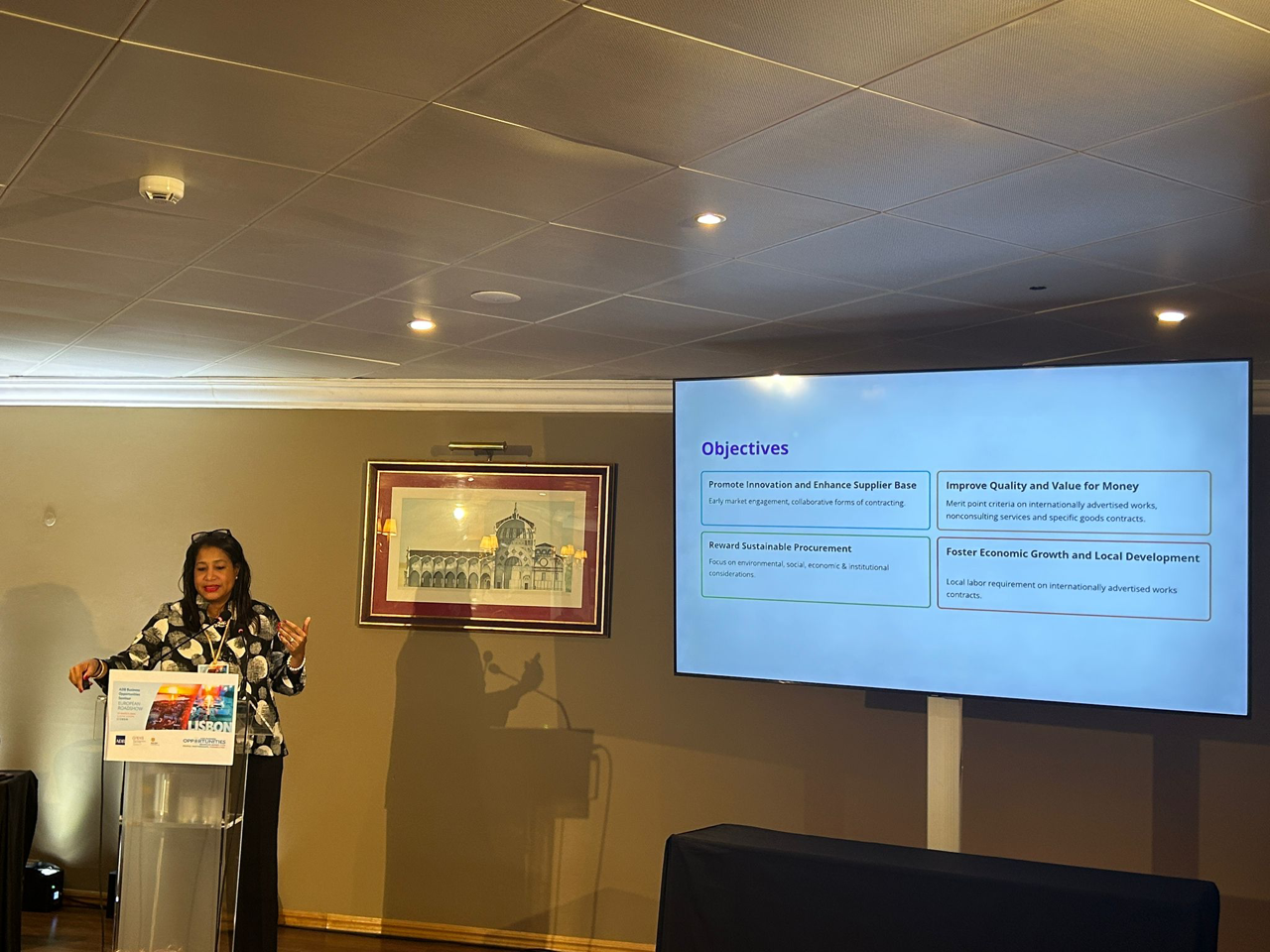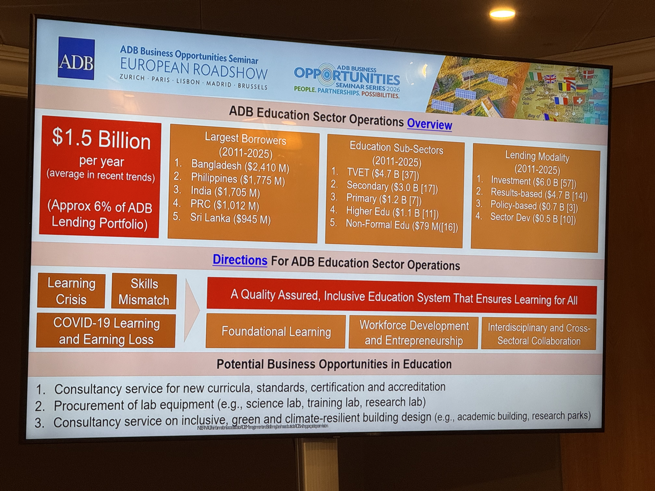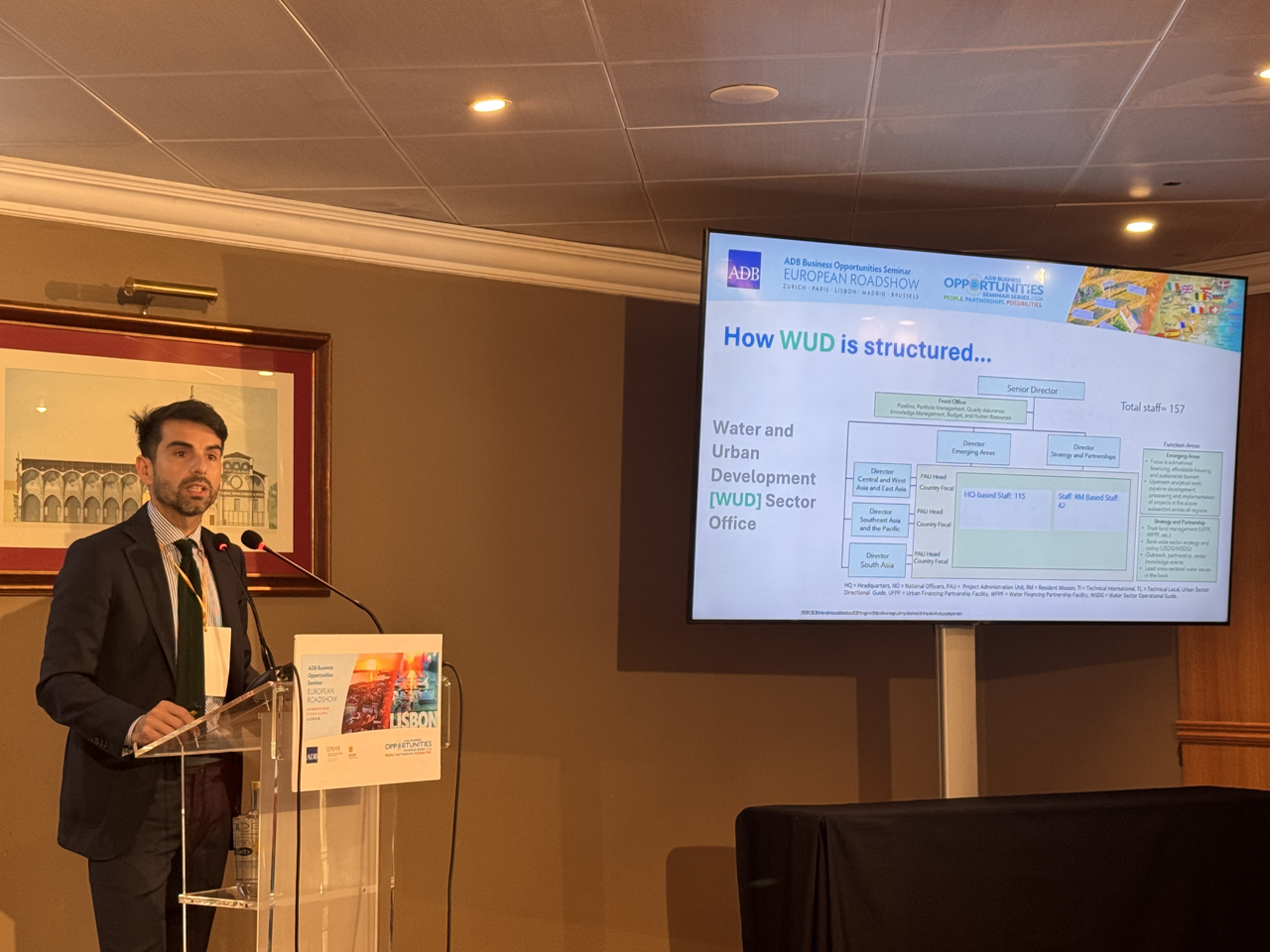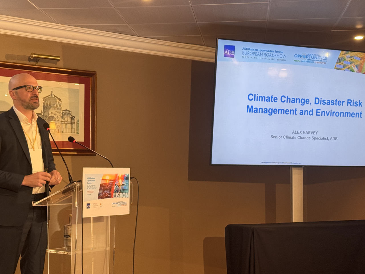 Event: Asian Development Bank’s Business Opportunities Seminar in Lisbon, Portugal (European Roadshow 2026) Photo Gallery: Asian Development Bank’s Business Opportunities Seminar in Lisbon, Asian Development Bank’s Business Opportunities Seminar in Lisbon, Portugal (European Roadshow 2026) 25 March 2026 Photos from the Asian Development Bank’s Business Opportunities Seminar in Lisbon (European Roadshow 2026) Disclaimer The views expressed on this website are those of the authors and do not necessarily reflect the views and policies of the Asian Development Bank (ADB) or its Board of Governors or the governments they represent. ADB does not guarantee the accuracy of the data included in this publication and accepts no responsibility for any consequence of their use. By making any designation of or reference to a particular territory or geographic area, or by using the term “country” in this document, ADB does not intend to make any judgments as to the legal or other status of any territory or area. Topics ADB Administration and Governance Finance