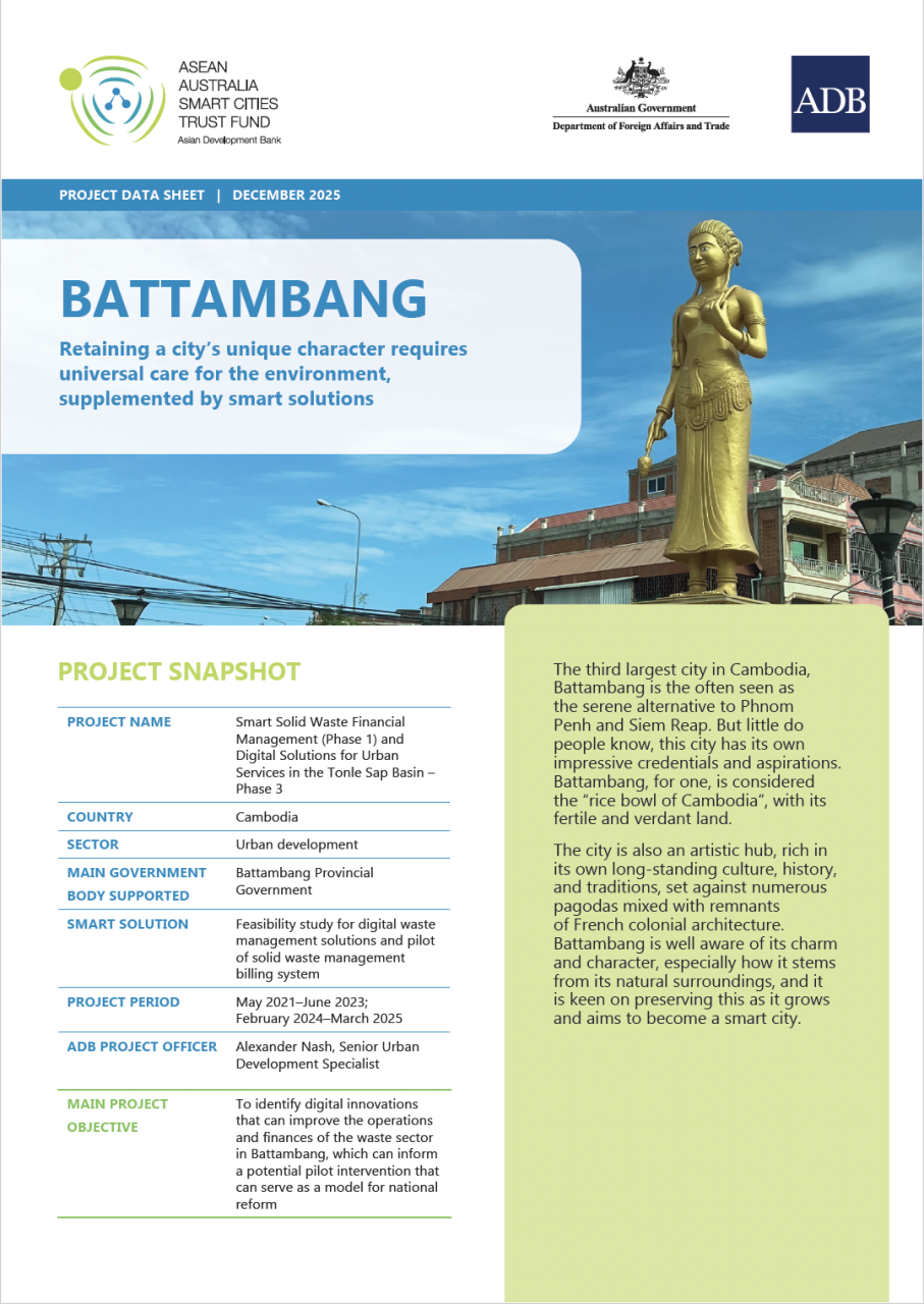 Event: ADB Data Room: ASEAN Australia Smart Cities Trust Fund AASCTF project data sheet: Battambang View File Battambang, the third largest city in Cambodia, is often seen as the serene alternative to Phnom Penh and Siem Reap. But little do people know, this city has its own impressive credentials and aspirations. Battambang, for one, aims to become a smart city. The ASEAN Australia Smart Cities Trust Fund (AASCTF) supported the Battambang Provincial Government with the Smart Solid Waste Financial Management project, delivering a feasibility study for digital waste management solutions and financing the pilot of a solid waste management billing system. This project data sheet is part of a collection that features 10 cities with direct interventions from AASCTF. Each data sheet provides a summary of the project, detailing challenges, solutions, and early impacts and benefits, as well how the solutions can be sustained long after project completion. The goal is to showcase how AASCTF has collaborated with the city and partners to catalyze people-centric smart solutions, which can hopefully be replicated or scaled in other Asian cities. AASCTF is financed by the Australian Government through the Department of Foreign Affairs and Trade, managed by the Asian Development Bank, and implemented by Ramboll. Disclaimer The views expressed on this website are those of the authors and do not necessarily reflect the views and policies of the Asian Development Bank (ADB) or its Board of Governors or the governments they represent. ADB does not guarantee the accuracy of the data included in this publication and accepts no responsibility for any consequence of their use. By making any designation of or reference to a particular territory or geographic area, or by using the term “country” in this document, ADB does not intend to make any judgments as to the legal or other status of any territory or area. Download Topics Urban Development