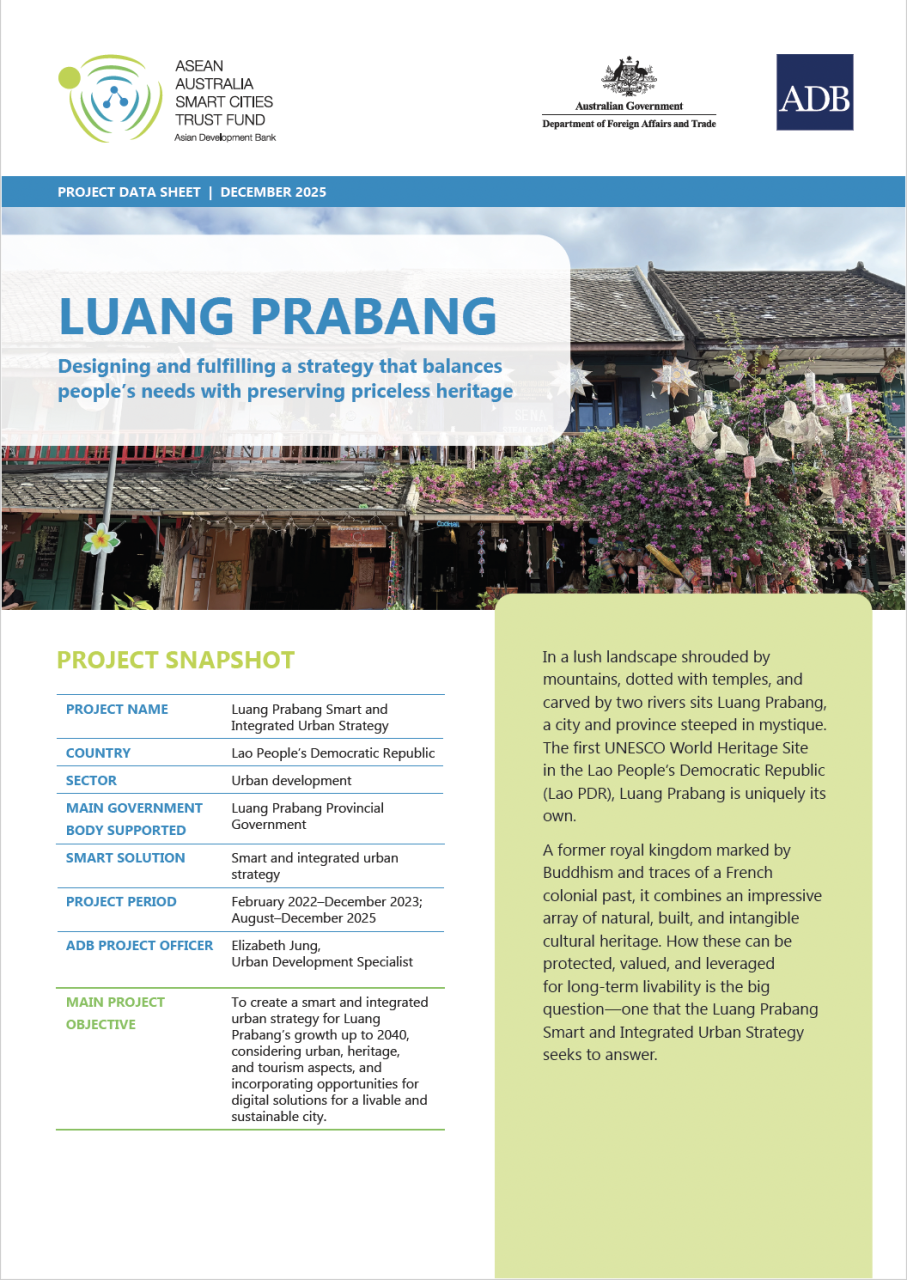 Event: ADB Data Room: ASEAN Australia Smart Cities Trust Fund AASCTF project data sheet: Luang Prabang View File Luang Prabang, the first UNESCO World Heritage Site in the Lao People’s Democratic Republic (Lao PDR), is uniquely its own. A former royal kingdom marked by Buddhism and traces of a French colonial past, it combines an impressive array of natural, built, and intangible cultural heritage. How these can be protected, valued, and leveraged for long-term livability is the big question. The ASEAN Australia Smart Cities Trust Fund (AASCTF) supported the Luang Prabang Provincial Government with the Luang Prabang Smart and Integrated Urban Strategy project, delivering the titular strategy backed by two supporting reports: the Urban Assessment and Urban Scenario reports. Together, this integrated strategy provides a comprehensive plan with an actionable list of projects centered on the city's vision of a livable heritage city for all. This project data sheet is part of a collection that features 10 cities with direct interventions from AASCTF. Each data sheet provides a summary of the project, detailing challenges, solutions, and early impacts and benefits, as well how the solutions can be sustained long after project completion. The goal is to showcase how AASCTF has collaborated with the city and partners to catalyze people-centric smart solutions, which can hopefully be replicated or scaled in other Asian cities. AASCTF is financed by the Australian Government through the Department of Foreign Affairs and Trade, managed by the Asian Development Bank, and implemented by Ramboll. Disclaimer The views expressed on this website are those of the authors and do not necessarily reflect the views and policies of the Asian Development Bank (ADB) or its Board of Governors or the governments they represent. ADB does not guarantee the accuracy of the data included in this publication and accepts no responsibility for any consequence of their use. By making any designation of or reference to a particular territory or geographic area, or by using the term “country” in this document, ADB does not intend to make any judgments as to the legal or other status of any territory or area. Download Topics Governance and Public Sector Management ICT Urban Development