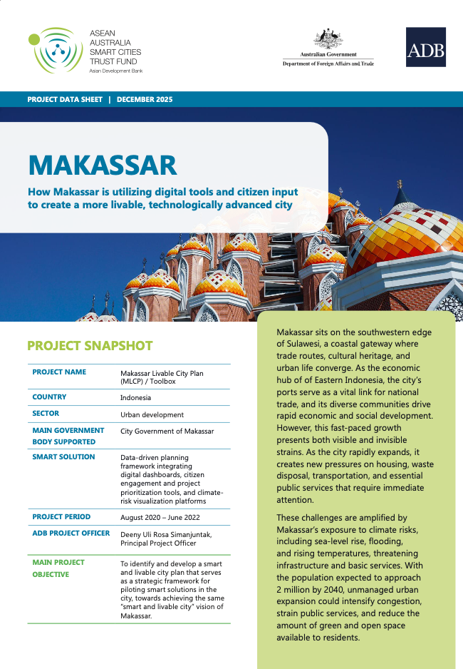 Event: ADB Data Room: ASEAN Australia Smart Cities Trust Fund AASCTF project data sheet: Makassar View File Makassar, the economic hub of Eastern Indonesia, sits on the southwestern edge of Sulawesi, where trade routes, coastal ecosystems, and dense urban communities converge. As the city continues to grow rapidly, it faces increasing pressure on housing, mobility, public services, and environmental systems, all while managing heightened exposure to climate risks such as flooding and sea-level rise. In response, Makassar has sought more coordinated, data-driven ways to guide growth and improve livability for its residents. The ASEAN Australia Smart Cities Trust Fund (AASCTF) supported the City Government of Makassar through the development of the Makassar Livable City Plan (MLCP). The project introduced an integrated, data-driven planning framework that brings together spatial analysis, digital tools, and citizen engagement to help city agencies prioritize investments, coordinate across sectors, and align long-term development with community needs. This project data sheet is part of a collection that features 10 cities with direct interventions from AASCTF. Each data sheet provides a summary of the project, detailing challenges, solutions, and early impacts and benefits, as well how the solutions can be sustained long after project completion. The goal is to showcase how AASCTF has collaborated with the city and partners to catalyze people-centric smart solutions, which can hopefully be replicated or scaled in other Asian cities. AASCTF is financed by the Australian Government through the Department of Foreign Affairs and Trade, managed by the Asian Development Bank, and implemented by Ramboll. Disclaimer The views expressed on this website are those of the authors and do not necessarily reflect the views and policies of the Asian Development Bank (ADB) or its Board of Governors or the governments they represent. ADB does not guarantee the accuracy of the data included in this publication and accepts no responsibility for any consequence of their use. By making any designation of or reference to a particular territory or geographic area, or by using the term “country” in this document, ADB does not intend to make any judgments as to the legal or other status of any territory or area. Download Topics Urban Development