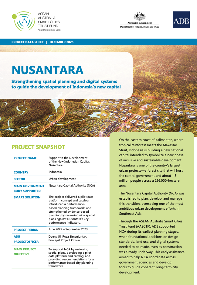 Event: ADB Data Room: ASEAN Australia Smart Cities Trust Fund AASCTF project data sheet: Nusantara Nusantara, Indonesia’s new national capital, represents one of the country’s most ambitious development efforts. Planned in East Kalimantan, the city is being built from the ground up to address long-standing challenges associated with congestion, environmental pressure, and uneven regional development. Nusantara is envisioned as a carbon-neutral, smart, and inclusive capital that sets a new benchmark for urban development in the region. To support this vision at a critical early stage, the ASEAN Australia Smart Cities Trust Fund (AASCTF) provided planning and digital foundations support to the Nusantara Capital Authority. The project focused on strengthening planning systems through a review of detailed spatial plans, the development of a pilot data platform and data management catalog, and recommendations for a performance-based city planning framework. These tools were designed to help guide coordinated decision-making as construction advanced and multiple agencies became involved. Battambang, the third largest city in Cambodia, is often seen as the serene alternative to Phnom Penh and Siem Reap. But little do people know, this city has its own impressive credentials and aspirations. Battambang, for one, aims to become a smart city. The ASEAN Australia Smart Cities Trust Fund (AASCTF) supported the Battambang Provincial Government with the Smart Solid Waste Financial Management project, delivering a feasibility study for digital waste management solutions and financing the pilot of a solid waste management billing system. This project data sheet is part of a collection that features 10 cities with direct interventions from AASCTF. Each data sheet provides a summary of the project, detailing challenges, solutions, and early impacts and benefits, as well how the solutions can be sustained long after project completion. The goal is to showcase how AASCTF has collaborated with the city and partners to catalyze people-centric smart solutions, which can hopefully be replicated or scaled in other Asian cities. AASCTF is financed by the Australian Government through the Department of Foreign Affairs and Trade, managed by the Asian Development Bank, and implemented by Ramboll. Disclaimer The views expressed on this website are those of the authors and do not necessarily reflect the views and policies of the Asian Development Bank (ADB) or its Board of Governors or the governments they represent. ADB does not guarantee the accuracy of the data included in this publication and accepts no responsibility for any consequence of their use. By making any designation of or reference to a particular territory or geographic area, or by using the term “country” in this document, ADB does not intend to make any judgments as to the legal or other status of any territory or area. Topics Urban Development