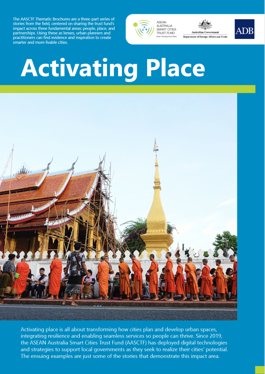 Event: ADB Data Room: ASEAN Australia Smart Cities Trust Fund AASCTF Thematic Brochures: Activating Place View File The thematic brochures of the ASEAN Australia Smart Cities Trust Fund (AASCTF) are a three-part series of stories from the field, centered on sharing AASCTF’s impact across three fundamental areas: people, place, and partnerships. Using these as lenses, urban planners and practitioners can find evidence and inspiration to create smarter and more livable cities. "Activating Place"—the second of AASCTF's three impact areas, sandwiched between "Empowering People" and "Convening Partnerships"—is all about transforming how cities plan and develop urban spaces, integrating resilience and enabling seamless services so people can thrive. Since 2019, AASCTF has deployed digital technologies and strategies to support local governments as they seek to realize their cities’ potential. The examples in this thematic brochure are just some of the stories that demonstrate this impact area. AASCTF is financed by the Australian Government through the Department of Foreign Affairs and Trade, managed by the Asian Development Bank, and implemented by Ramboll. Disclaimer The views expressed on this website are those of the authors and do not necessarily reflect the views and policies of the Asian Development Bank (ADB) or its Board of Governors or the governments they represent. ADB does not guarantee the accuracy of the data included in this publication and accepts no responsibility for any consequence of their use. By making any designation of or reference to a particular territory or geographic area, or by using the term “country” in this document, ADB does not intend to make any judgments as to the legal or other status of any territory or area. Download Topics Governance and Public Sector Management ICT Urban Development