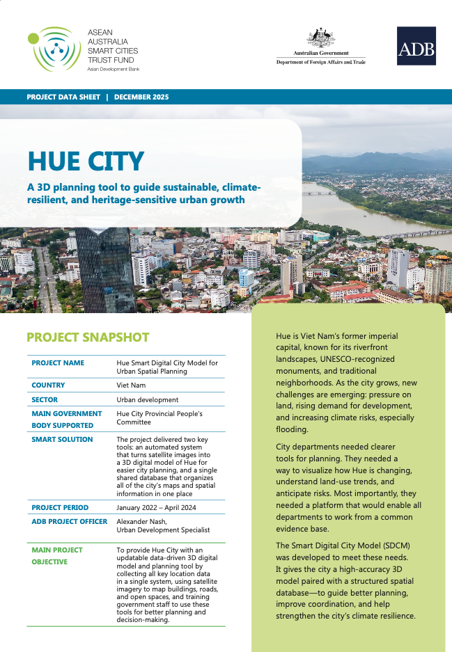 AASCTF project data sheet: Hue Read more about AASCTF project data sheet: Hue Huế, Viet Nam’s ancient capital, is renowned for its rich cultural heritage, historic architecture, and unique urban landscape shaped by centuries of history. As the city continues to grow, it faces the challenge of managing urban development and climate risks while preserving the cultural and natural assets that define its identity.